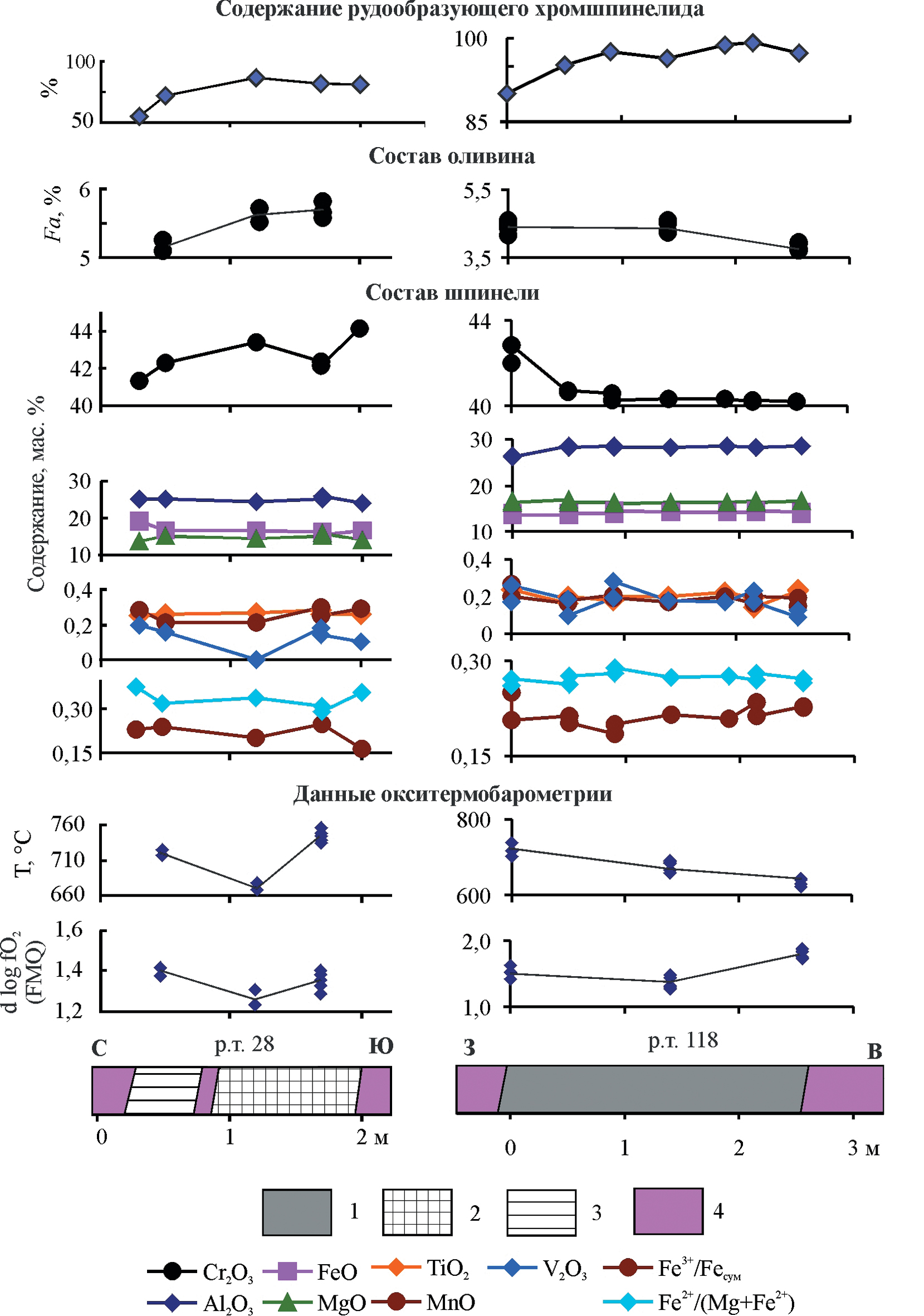 Фиг. 10. Изменение химического состава рудообразующего шпинелида, температуры оливин-хромшпинелевого равновесия и фугитивности кислорода внутри тел хромититов № 28 и № 118 Ямботывисской площади. 1–3 – структура хромититов по содержанию рудообразующего шпинелида: 1 – сплошные, 2 – густовкрапленные; 3 – средневкрапленные; 4 – дуниты.