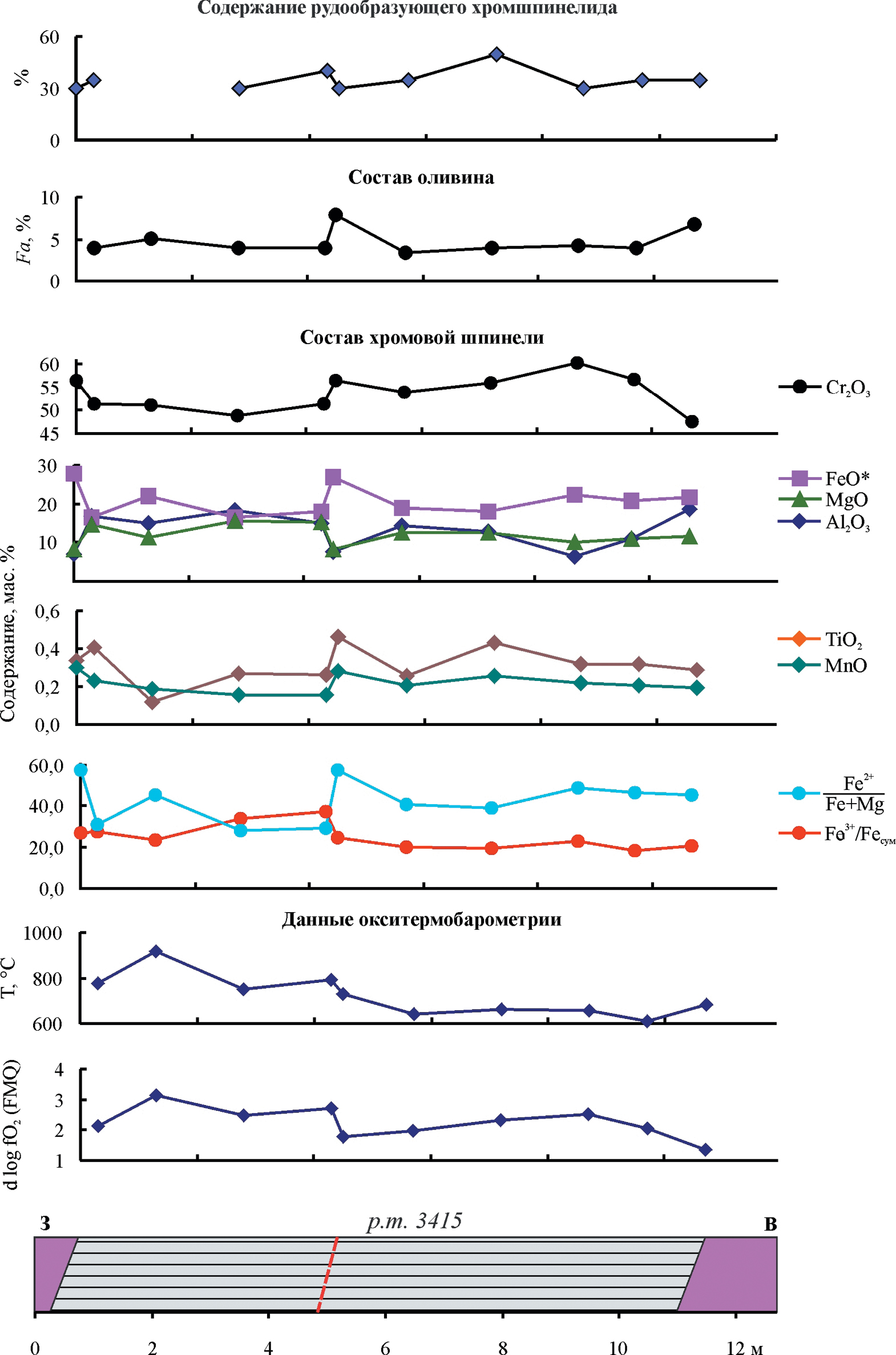 По химическому составу рудообразующего шпинелида внутри рудного тела № 3415 Аркашорского рудопроявления выделяется два блока – западный и восточный, которые имеют мощности 4.2 и 6 м соответственно (см. фиг. 12). Рудообразующие хромшпинелиды западного блока содержат Cr2O3–48–56 мас. %; Al2O3–6.9–18.4 мас. %; MgO – 7–16 мас. %. При этом в его пределах содержание Cr2О3 в минерале повышается к контактам с вмещающими породами на западе и рудами восточного блока на востоке, а магния и алюминия, напротив, понижается. В пределах восточного блока наблюдается обратная картина – во внутренней его части содержание Cr2O3 в шпинелиде наиболее высокое – 60.2 мас. %, а к контактам его количество снижается до 47.56 мас.%. Содержание Al2O3 увеличивается к контакту с 6.58 до 18.72 мас. %; изменение содержания MgO менее выражено. Количество компонента убывает к восточному контакту с 12.7 во внутренней части рудного тела до 11.58 мас. % MgO, вблизи контакта.