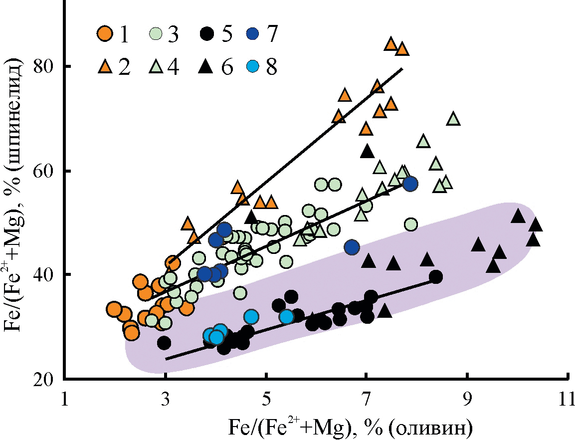 Фиг. 13. Диаграмма зависимости железистость оливина – железистость шпинелида. Условные обозначения: 1, 2 – месторождение Центральное, 1 – хромовые руды, 2 – рудовмещающие породы; 3, 4 – рудопроявление Енгайское-1, 3 – хромовые руды, 4 – рудовмещающие породы; 5, 6 – Ямботывисская площадь, 5 – хромовые руды, 6 – рудовмещающие породы; 7, 8 – хромовые руды рудопроявления Аркашорское, 1 – восточный блок, 2 – западный блок. Сиреневое поле – составы минералов из хромититов и рудовмещающих ультрамафитов месторождения Алмаз-Жемчужина, Кемпирсайский массив, Казахстан (по Царицын, Алимов, 1983).