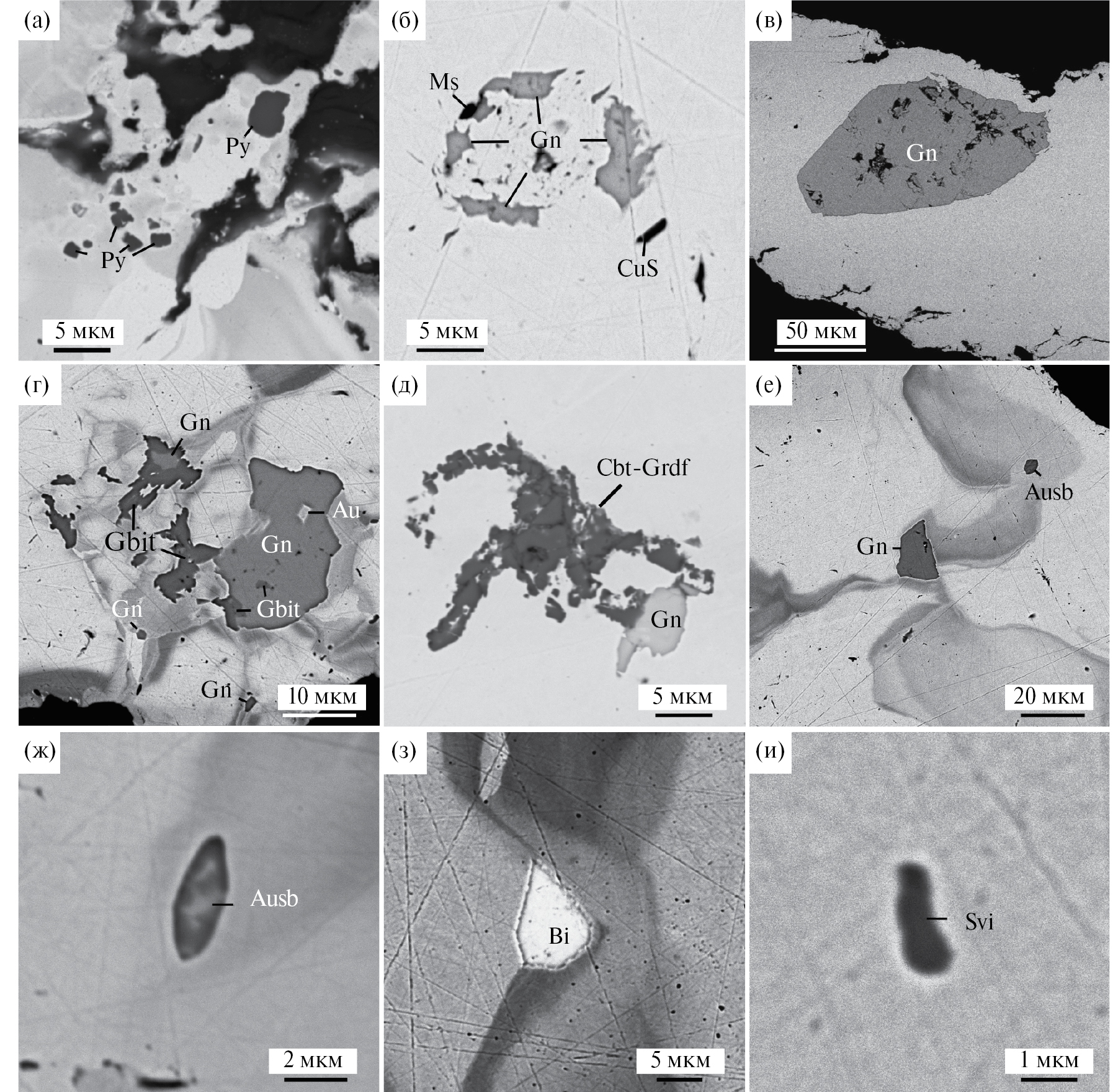 К потенциально золотоносным можно отнести зоны развития прожилково-вкрапленной и вкрапленной сульфидной (сульфидно-кварцевой) минерализации, наблюдающиеся в интенсивно рассланцованных рифейских породах Кыввожского района. Одна из таких зон, отмечавшаяся выше, хорошо вскрыта при промышленной разработке Среднекыввожской россыпи (фиг. 17). Эта зона, изученная нами ранее (Кузнецов и др., 2014), характеризуется развитием преимущественно пирита, присутствием галенита, халькопирита, герсдорфита, пирротина, кобальтина, сфалерита, ковеллина, минералов висмута и теллура. В ассоциации с ними находятся минералы редких земель – монацит, ксенотим, отмечаются минеральные фазы Ag-Se, Pb-Nb, Th-U, Sr-Tb состава. Выделяются две основные стадии минералообразования: ранняя – пиритовая и поздняя – сфалерит-халькопирит-галенитовая с минералами редких металлов и редких земель. К сожалению, самородное золото в этих зонах пока не обнаружено, но, вероятнее всего, оно отвечает поздней стадии минералообразования и развито весьма неравномерно.