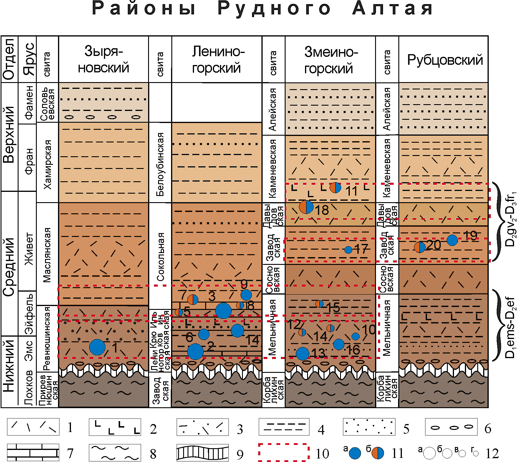 Рудные районы Рудного Алтая представляют собой крупные вулкано-тектонические депрессии, выполненные отложениями, как правило, одной рудоносной формации (базальт-риолитовой или базальтсодержащей риолитовой) (Яковлев, 1972, 1984; Кузнецов и др., 2019). На примере металлогенических зон Рудного Алтая показано, что среди них выделяются краевые и внутренние депрессии (Авдонин, 1981; Палеовулканологический…, 1984; Яковлев, 1984). Размеры рудных районов составляют: длина – 20–80 км, ширина – 10–30 км, размах по вертикали – 0.3–1.5 км, площадь выхода на поверхность – 200–1500 км2. Рудные районы соответствуют крупным вулкано-плутоническим депрессиям, которые выполнены вулканическими и вулканогенно-осадочными породами, а также подстилающими и перекрывающими существенно терригенными образованиями. Подстилающие породы представлены комплексом основания – породами известково-терригенной формации нижнего палеозоя (S-D1), а перекрывающие – породами терригенной и флишоидной вулкано-терригенной формаций верхнего девона (Дубатолов и др., 1980; Козлов, Дубатолов, 1994; Козлов, 2015; Кузнецов и др., 2019).