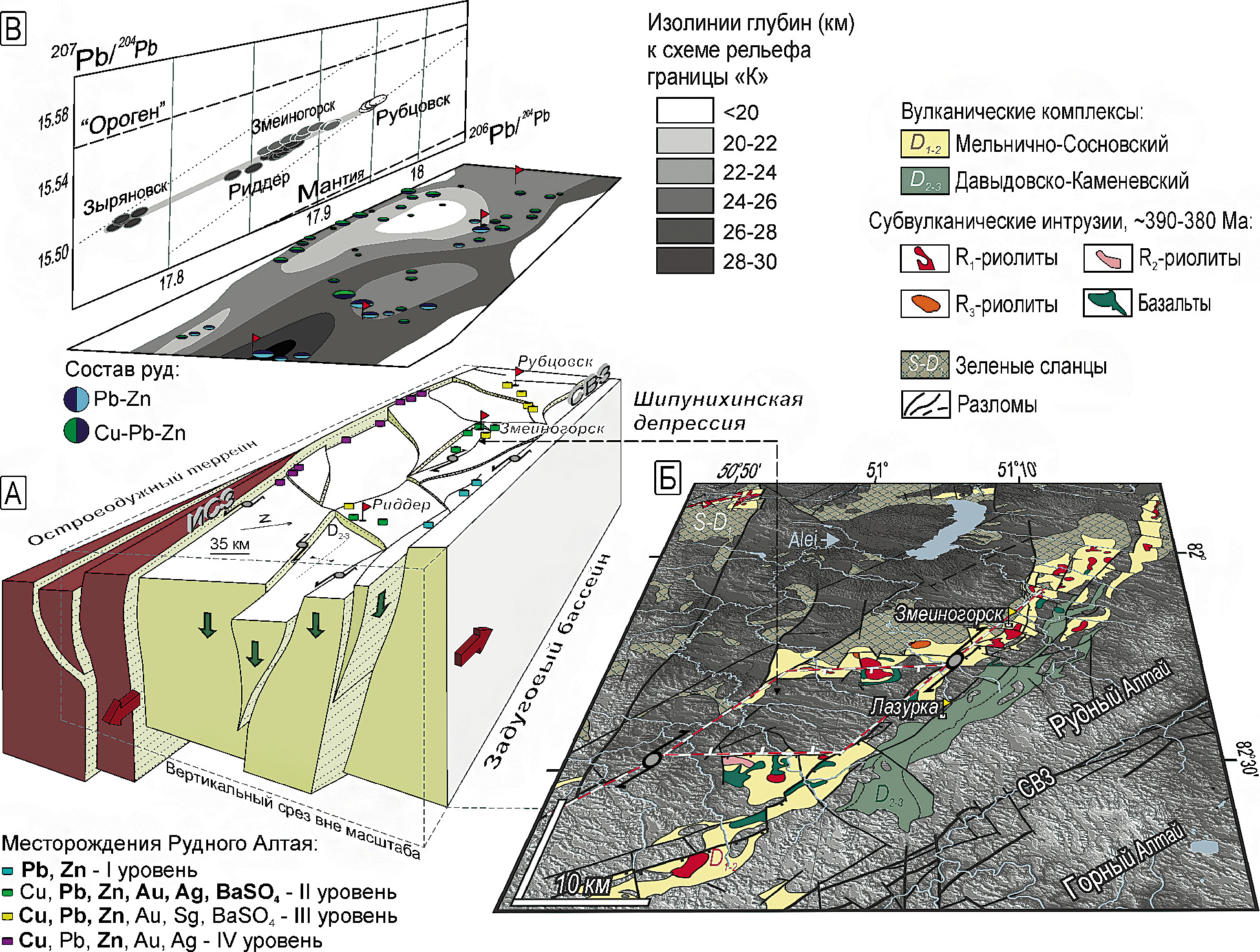 Территория исследований расположена в западной части Алтае-Саянского сектора Центрально-Азиатского складчатого пояса (ЦАСП) или Алтайского тектонического коллажа – Алтаид (Зоненшайн, Кузьмин, 1992; Şеngör et al., 1993; Добрецов и др., 1994; Берзин, Кунгурцев, 1996; Владимиров и др., 2003; Seltman et al., 2007; Windley et al., 2007; Буслов, 2011; Ярмолюк и др., 2013; Xiao, Santosh, 2014 и др.). Рудноалтайский блок представляет собой фронтальную часть девонской активной окраины, ограниченную Иртышской сдвиговой зоной от фрагмента плиты Иртыш-Зайсанского палеоокеана и Северо-Восточной зоной смятия – от надвинутых со стороны Сибирского континента тектонических блоков Горного Алтая. К началу девонской тектоно-магматической активизации регион существовал как часть обширного, террасировано погруженного материково-шельфового бассейна в пределах пассивной окраины Сибирского континента (Елкин и др., 1994; Filippova et al., 2001). С позиции тектоники плит заложение вулканического пояса произошло на сегменте пассивной окраины с энсиматическим основанием, состоящим из каледонских океанических и островодужных фрагментов, вошедших в состав террейно-орогенного обрамления Сибирского континента на предыдущем аккреционно-коллизионном этапе. Глубинные геофизические исследования показывают под Рудным Алтаем увеличенный “базальтовый” слой (28–36 км), сокращенный “гранитный” слой (8–14 км) с признаками базификации и гребневидный выступ границы Мохо СЗ простирания (Вулканогенные…, 1978; Щерба и др., 1984), что позволяло предположить астеносферный апвелинг, связанный с растяжением континентальной литосферы (Большой Алтай…, 1998, 2000).