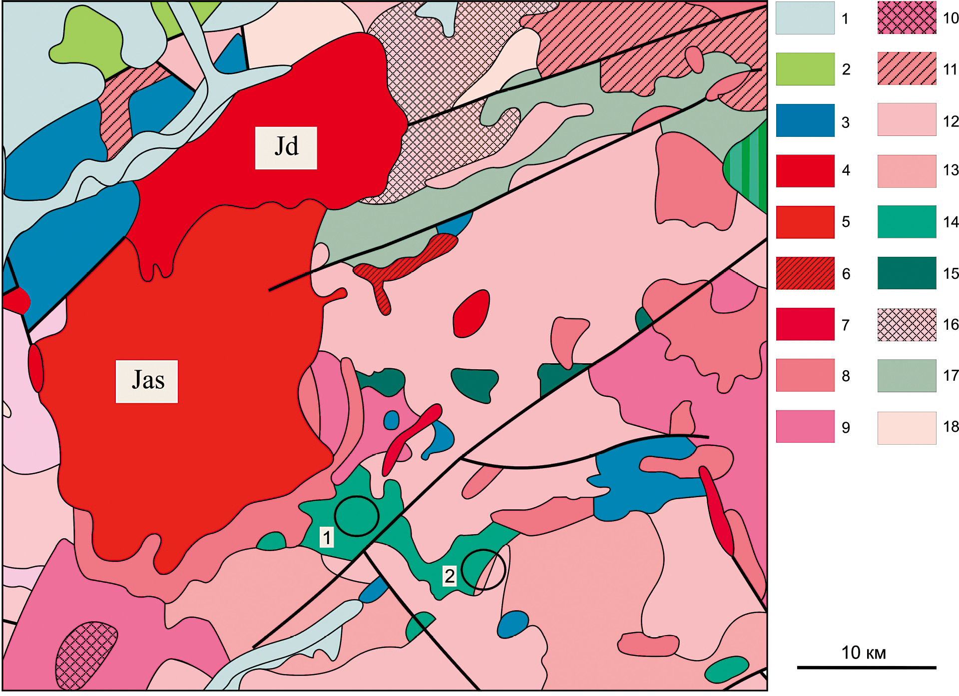 Фиг. 1. Геологическая схема Дарасунского рудного поля и его окружения (Геологическое…, 1997). 1 – четвертичные отложения; 2 – тургинская подсерия: верхняя – песчаники, алевролиты, аргиллиты, конгломераты, андезибазальты, трахибазальты, риолиты, туфы, туфогенно-осадочные породы, каменные угли; 3 – нерчинская серия: нерасчлененная – латиты, кварцевые латиты, трахиандезибазальты, трахибазальты, трахиандезиты, трахириодациты, риолиты, трахириолиты, туфы, конгломераты, песчаники, алевролиты, туфогенно-осадочные породы; 4 – дотулурский комплекс: лейкограниты, пегматоидные граниты, амазонитовые граниты; 5–7 амуджикано-сретенский комплекс: 5 – II фаза – кварцевые сиениты; 6 – гранодиорит-порфиры, 7 – гранит-порфиры; 8–10 – амананский комплекс: 8 – II фаза – граниты, аплитовидные граниты; 9 – I фаза – кварцевые сиениты; 10 – I фаза – граниты; 11 – бичурский комплекс III фаза – лейкограниты, граниты, гранит-порфиры, кварцевые сиениты; 12 – олекминский комплекс – граниты; 13 –крестовский комплекс – гранодиориты, кварцевые диориты, диориты, кварцевые сиениты, тоналиты, плагиограниты, граниты, гранодиориты, кварцевые сиениты, граниты; 14, 15 – кручининский комплекс: 14 – габбро; 15 – габбродиориты; 16 – позднестановой комплекс: гранодиориты; 17 – олошкинский комплекс: диориты; 18 – тунгирский комплекс: гнейсы, мигматиты. Кружки – месторождения золота: 1 – Талатуй, 2 – Дарасун.