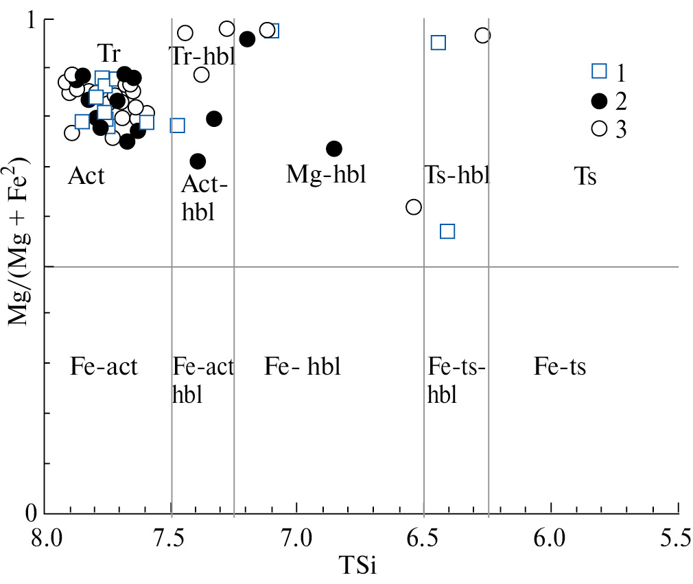 Фиг. 6. Классификационная диаграмма Ca-амфиболов ИВ: 1 – габбронориты и пятнистые анортозиты, залегающие стратиграфически выше ЭПГ рифа; 2 – ЭПГ риф, 3 – габбронориты, подстилающие ЭПГ риф (по Leake et al., 1997).