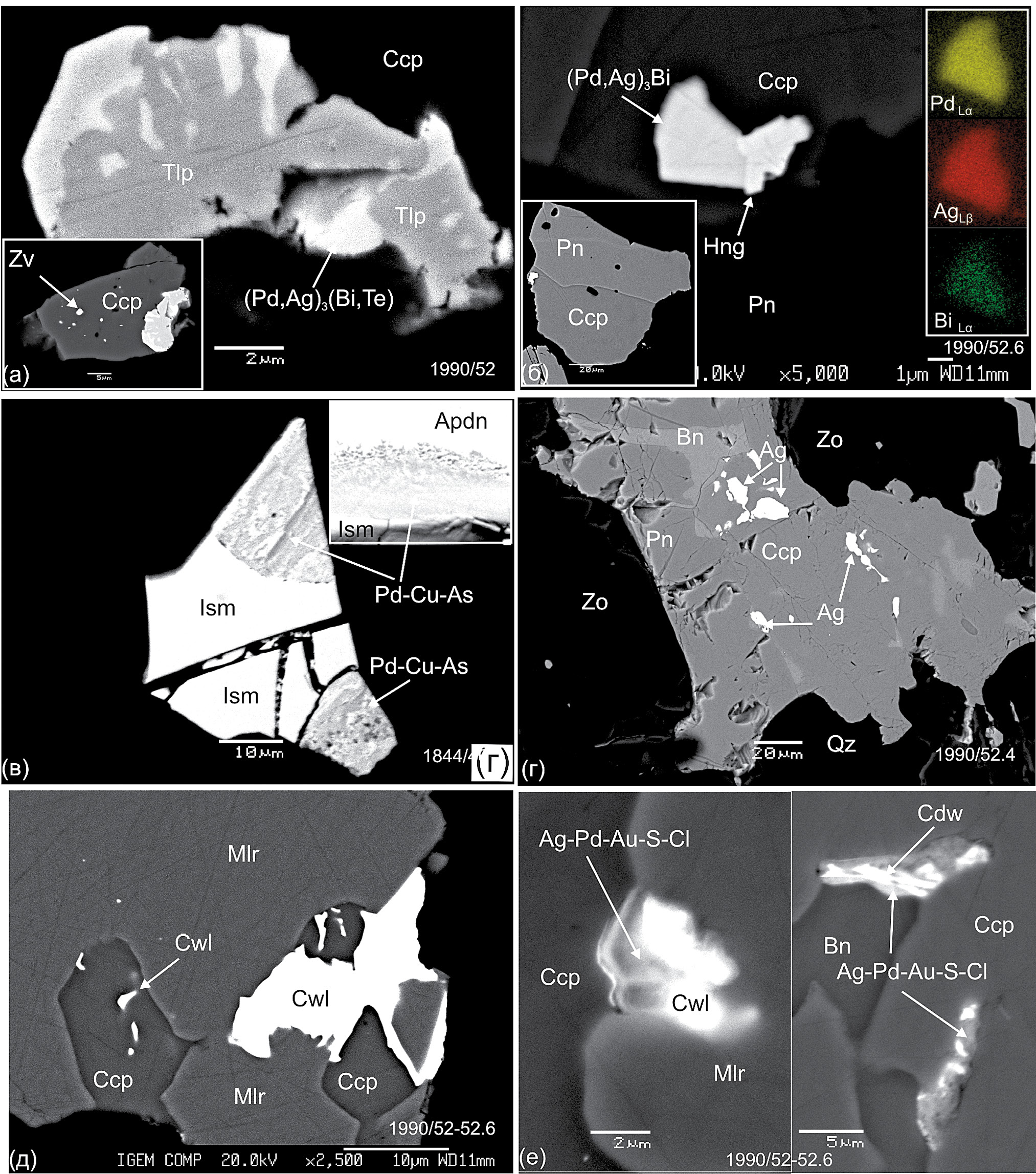 Минералы золота и серебра. Самородное золото и AuAg сплавы образуют мелкие зерна и полиминеральные срастания с МПГ в сульфидах и на контакте их с силикатами (фиг. 10в, фиг. 11а, г, з). Содержания Au и Ag варьируют в широких пределах, основными примесями являются Pd, Cu и Hg. Гессит встречается в срастаниях с Pd-висмутотеллуридами, науманнит очень редок и образует субмикронные включения в халькопирите. Самородное серебро выделяется в виде многочисленных мелких включений и зерен размером 10-40 mм в борните, миллерите и халькопирите (фиг. 12г).