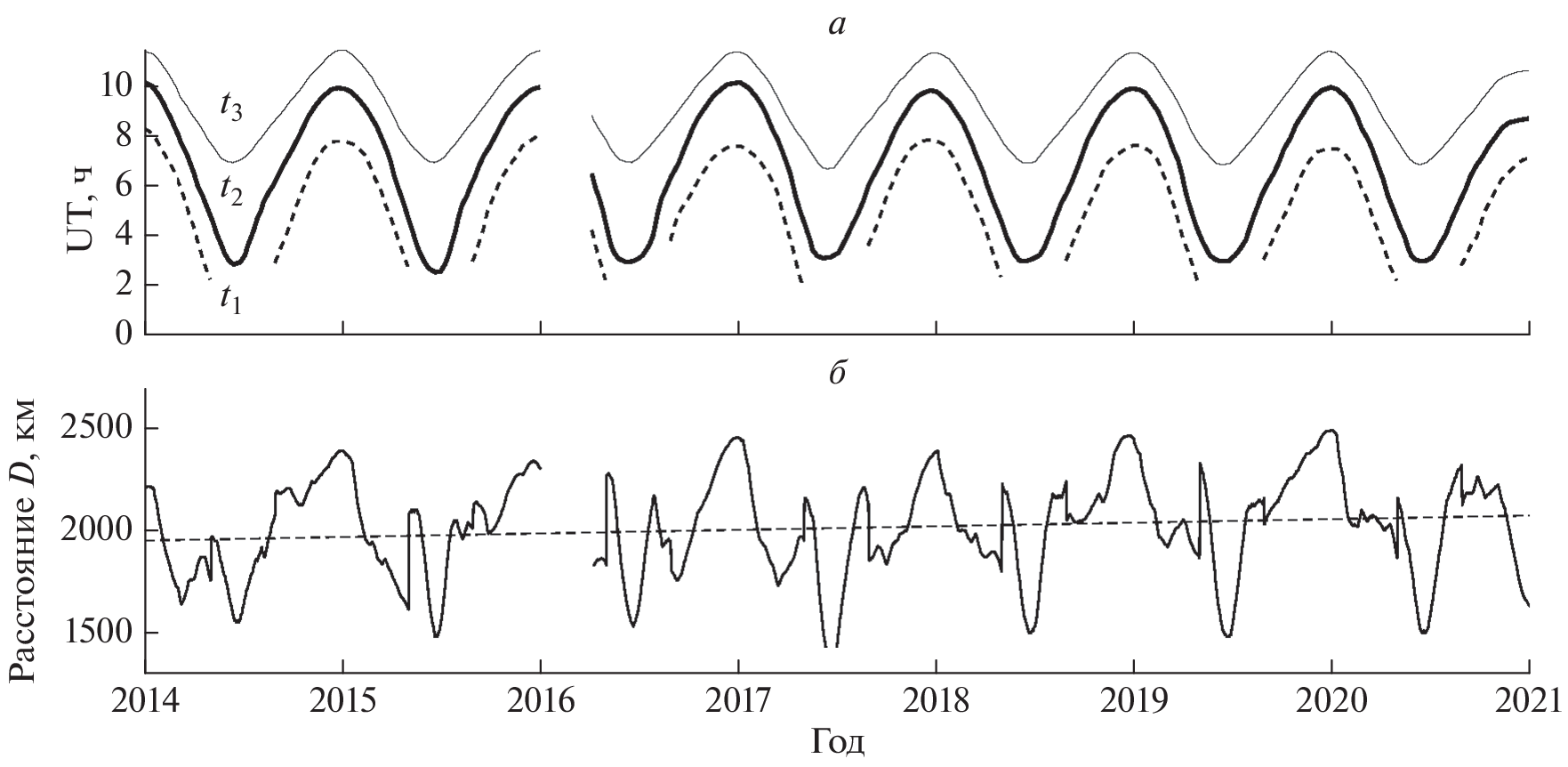 Обсуждается влияние освещенности трассы на амплитуду сверхдлинноволновых радиосигналов при прохождении солнечного терминатора. На основе многолетних измерений (с 2014 по 2020 г.) показано, что в зимний период резкое падение амплитуды сигнала на среднеширотных трассах происходит уже при освещении 15% длины трассы. Анализ вариаций амплитуды сверхдлинноволновых сигналов также позволил оценить высоту их отражения от верхней стенки неосвещенной части волновода hN (D – область ионосферы) и выявить сезонные и годовые вариации этой величины. Экспериментально обнаружен тренд увеличения hN примерно на 4 км за семь лет, вызванный спадом солнечной активности в этот период.