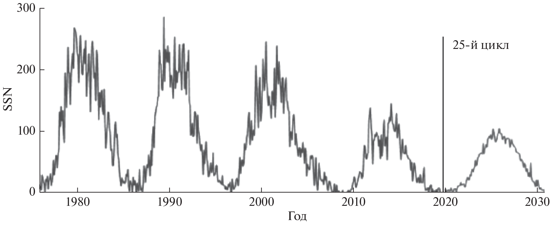 Анализируется возможность прогнозирования функции временнóй зависимости числа солнечных пятен (SSN) в цикле солнечной активности на основе применения платформы искусственной нейронной сети Элмана к историческому ряду данных наблюдений. Предложен метод нормализации исходных данных для предварительного обучения алгоритма ИНС, в котором строится последовательность виртуальных идеализированных циклов, используя масштабируемые коэффициенты по длительности и значения максимумов в солнечных циклах. Корректность метода анализируется в численном эксперименте, основанном на моделировании временнóго ряда солнечных пятен. Оценены интервалы изменения адаптируемых параметров в работе ИНС и предложен математический критерий для выбора решения. Характерным свойством построенной функциональной зависимости в цикле числа солнечных пятен является значительная асимметрия ее восходящей и спадающей ветвей. Представлен прогноз временнóго хода на текущий 25-й цикл солнечной активности и обсуждается его корректность в сравнении с другими результатами прогнозирования и имеющимися данными обсерваторских наблюдений.