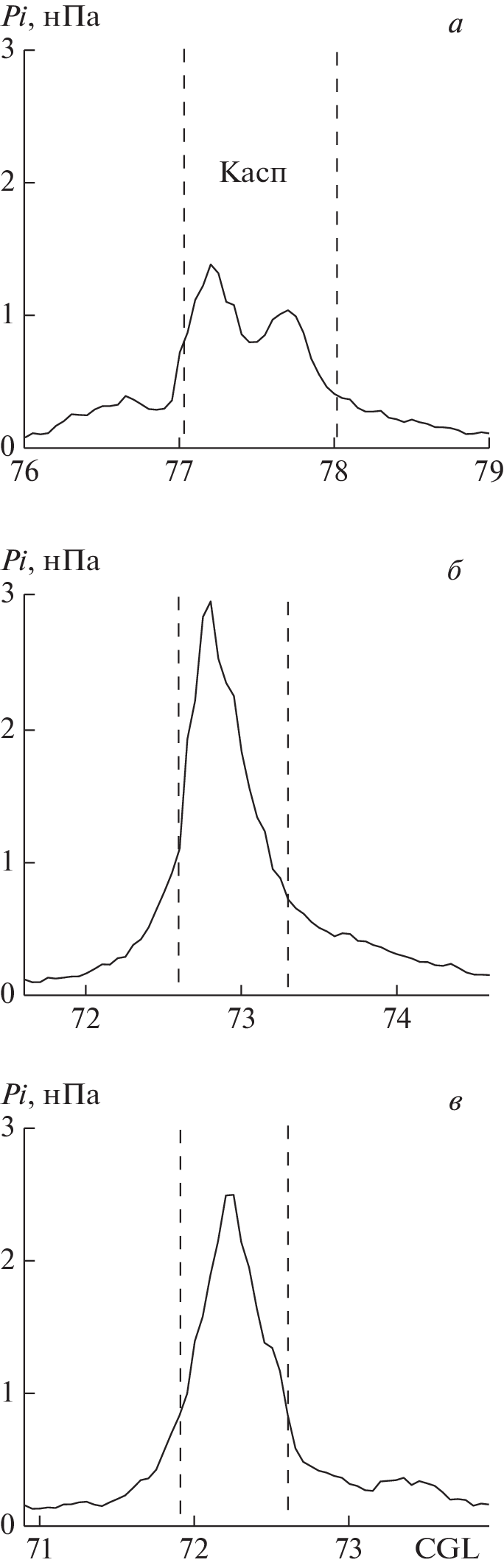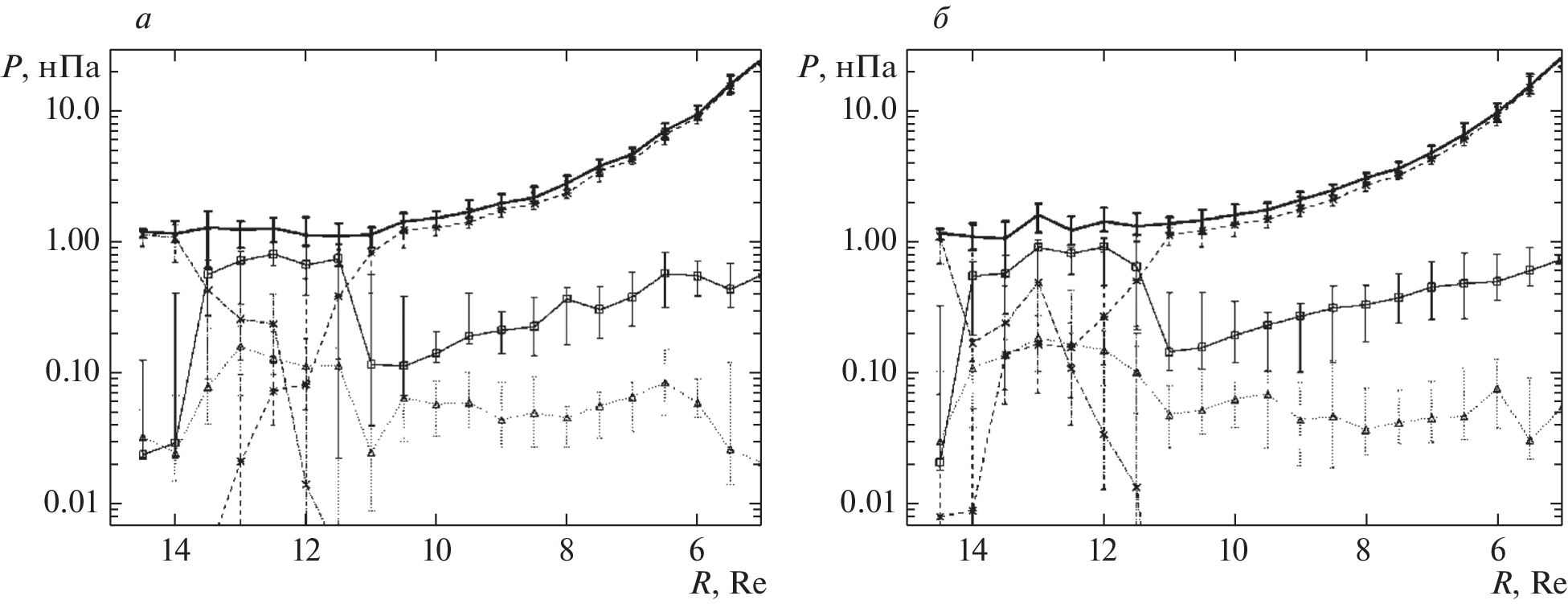 The results of observations of low-altitude spacecraft crossing the daytime sector of the auroral zone and of high-apogee spacecraft in the equatorial plane of the magnetosphere were analyzed in order to identify the main processes leading to the formation of dayside polar cusps. Observations from the DMSP F7 spacecraft were used to analyze the latitudinal characteristics of ion precipitation in the cusp region and to study the latitudinal profile of ion pressure in the cusp depending on the IMF parameters. A significant difference was found in identifying the cusp boundaries using an automated data processing system and direct analysis of spacecraft observations. It is shown that for small negative values of the Bz-component of the IMF (〈Bz〉 = –3.0 nT), an ordinary feature of the cusp is the latitudinal profile of the ion pressure (Pi) with a width of ~1° of latitude with two maxima, one of which is located in the equatorward and the other in the poleward of the cusp. For large negative Bz values (–6, –8 nT), the polar maximum in the latitudinal profile Pi disappears; only the equatorial maximum remains, the Pi level at the maximum increases, and the width of the cusp decreases to ~0.7°. For Bz IMF > 0, the most characteristic is the Pi profile with a maximum ion pressure in the polar part of the cusp. The cusp for Bz > 0 is located at higher latitudes than for Bz < 0, and its average latitudinal width increase to ~1.4° of latitude. In the prenoon sector MLT, the most typical for periods with a large negative By-component of the IMF (〈By〉 = –6.3 nT, 〈Bz〉 = –1.7 nT) is a cusp with a width of ~1.4° of latitude with a flat top in the latitudinal Pi profile. Comparison of the pressure distributions observed at low heights with data from high-apogee satellites confirmed the possibility of describing the formation of the cusp as a diamagnetic cavity and using observations in the cusp to determine the ion pressure in the magnetosheath.