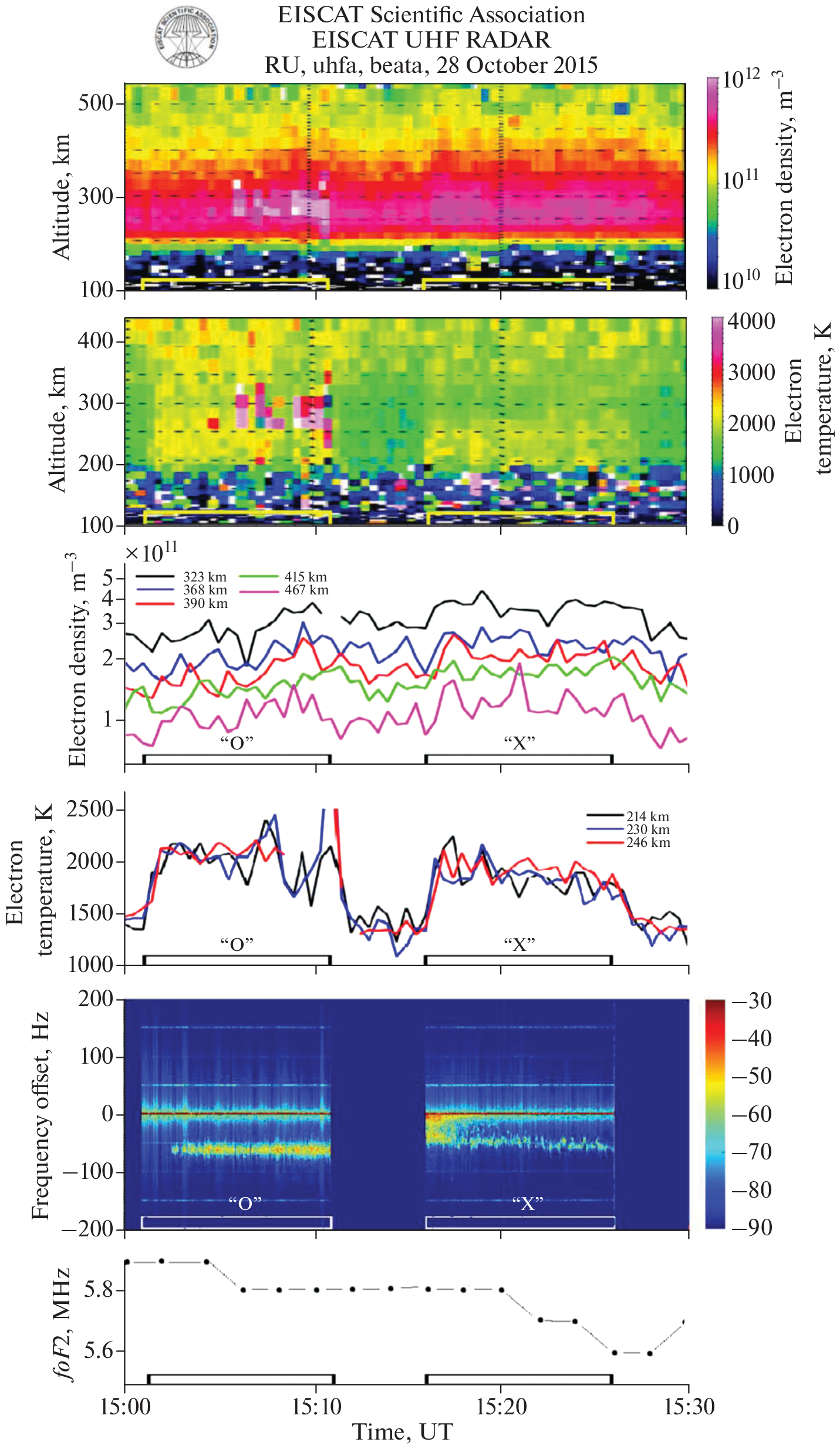 Представлены результаты экспериментальных исследований явлений в высокоширотной верхней (F-область) ионосфере, вызванных воздействием мощных радиоволн КВ-диапазона обыкновенной (О-мода) поляризации на частотах нагрева fH, существенно превышающих критическую частоту слоя F 2 (fH – fоF2 = 0.9–1.1 МГц). Результаты базируются на данных экспериментов, выполненных на КВ нагревном стенде EISCAT/Heating в г. Тромсё, северная Норвегия (69.6° N, 19.2° E). В период экспериментов мощная радиоволна КВ-диапазона О-поляризации излучалась в направлении магнитного зенита с максимальной эффективной мощностью излучения 350–550 МВт. Впервые обнаружено, что в условиях, когда мощная радиоволна КВ-диапазона О-поляризации не отражалась от ионосферы, происходит образование дактов повышенной электронной плотности Ne, генерация мелкомасштабных искусственных ионосферных неоднородностей и узкополосного (в полосе ±1 кГц относительно частоты нагрева) искусственного радиоизлучения ионосферы, регистрируемого на расстоянии ~1200 км от нагревного стенда. Выполнено сравнение характеристик мелкомасштабных искусственных ионосферных неоднородностей и спектральной структуры искусственного радиоизлучения ионосферы при альтернативном О-/Х- нагреве в магнитный зенит на частотах, существенно превышающих критическую частоту слоя F2. Установлено, что в целом их поведение имеет одинаковый характер, однако эволюция развития рассмотренных явлений при О- и Х-нагреве отличается.