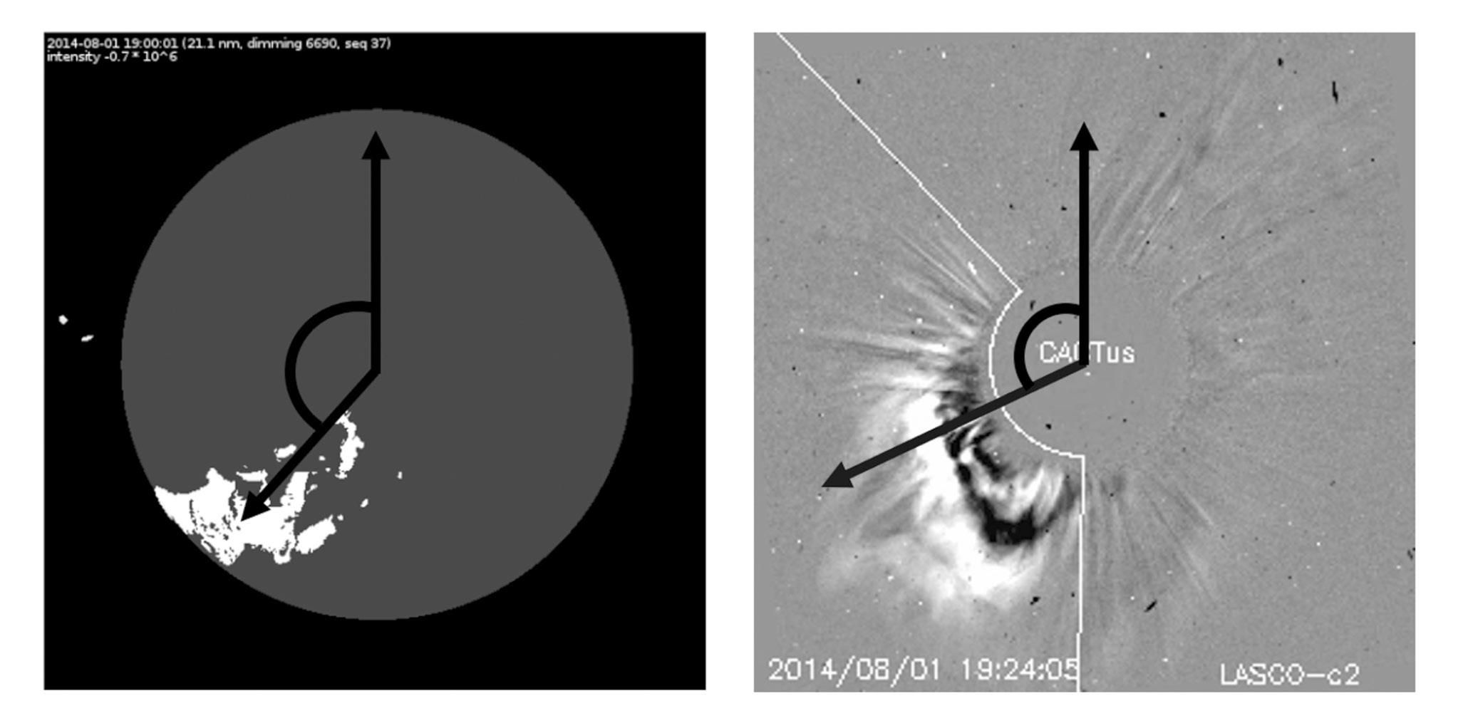 КВМ считался соответствующим диммингу, если он зарегистрирован позже него, но не позднее двух часов. Также для установления соответствия была проведена проверка по местоположению КВМ и димминга. КВМ наблюдается на коронографе, а димминг − на диске Солнца. В качестве пространственного параметра, позволяющего связать два события, мы выбрали позиционный угол (рис. 1). Для КВМ угол рассчитывается автоматически системой CACTus. Для димминга угол рассчитывается между радиус-вектором из центра Солнца к геометрическому центру димминга на диске Солнца и направлением на север против часовой стрелки. КВМ считается связанным с диммингом, если различие их позиционных углов не превышает 90°. Если угловой раствор КВМ более 180° либо димминг находился близко к центру диска (расстояние от геометрического центра димминга менее 0.25 радиусов Солнца), то димминги и КВМ считались связанными без этой проверки и события сразу попадали в базу [Shugay et al., 2022].