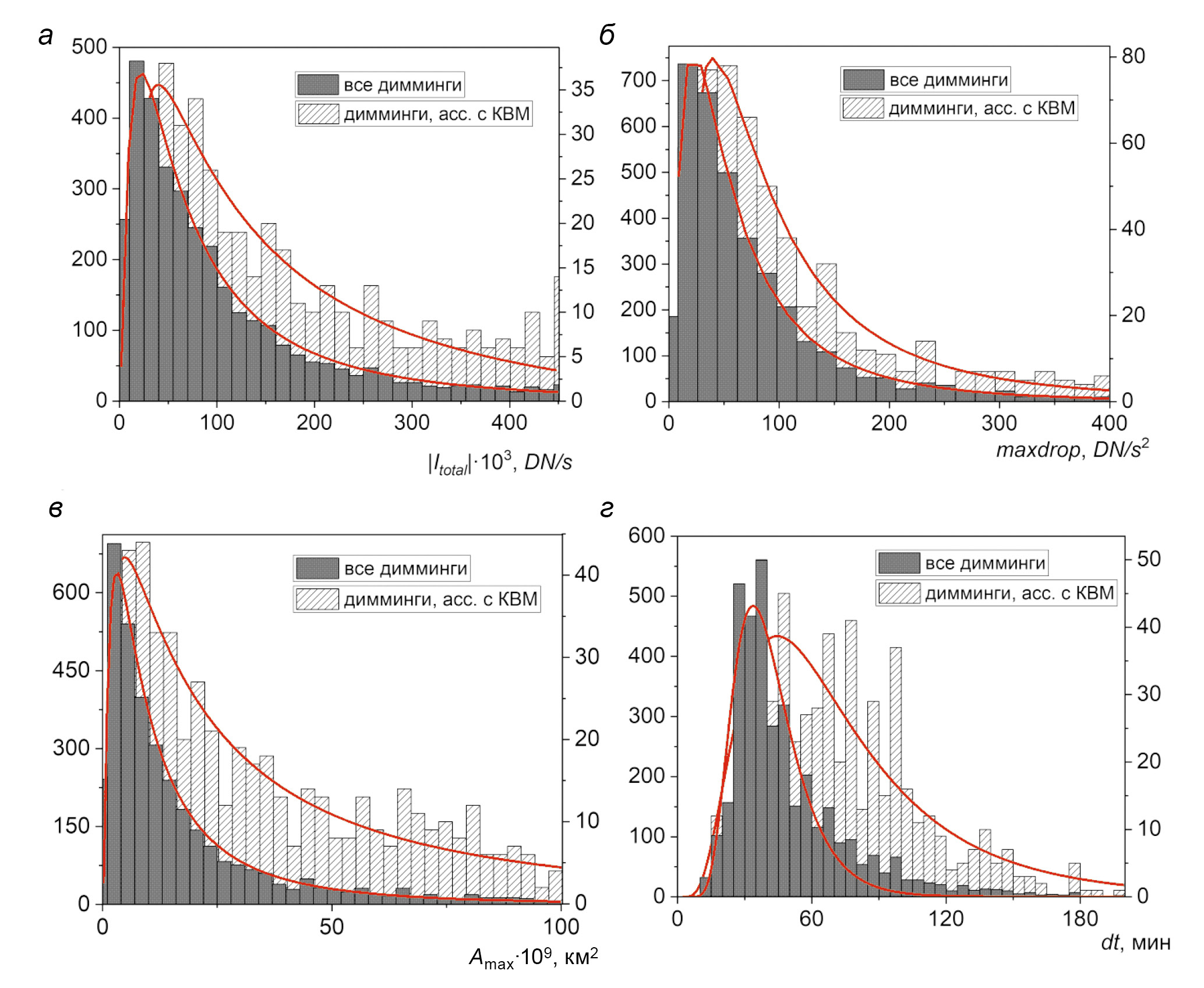 Рис. 2. Гистограммы распределения параметров димминга: (а) − максимального значения модуля полной яркости; (б) — максимального скачка яркости; (в) — максимальной площади; (г) — продолжительности димминга. По оси Y слева отложено количество событий для всех диммингов (черные столбцы), справа — количество событий для диммингов, соотнесенных с КВМ (заштрихованные столбцы). Кривые обозначают аппроксимацию плотностью логнормального распределения.