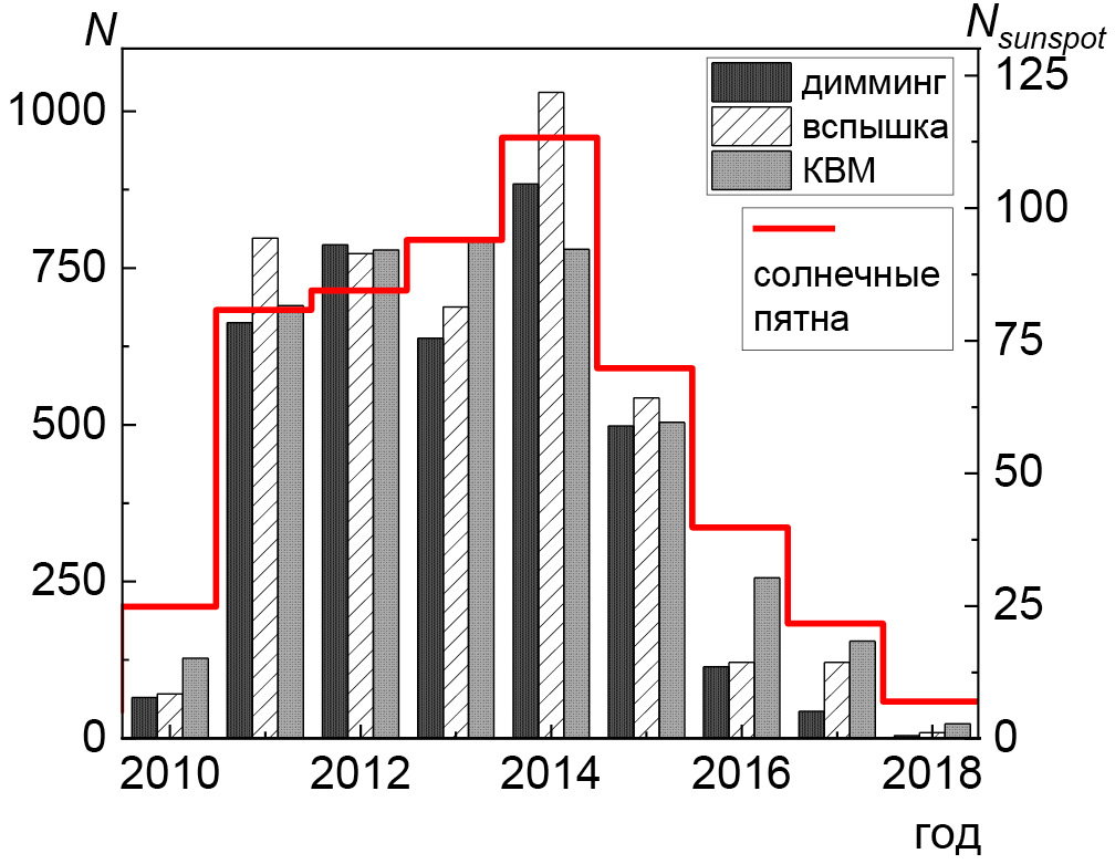 Возможно, причина малого количества диммингов связана с критериями регистрации диммингов, которые сложнее выделить на фоне сниженной яркости солнечного диска в период спада и минимума солнечного цикла на длине волны 211 Å. В работе [Shugai [2021] обсуждается улучшение качества определения границ корональных дыр (объектов пониженной интенсивности) при изменении параметров порогового алгоритма с учетом сильного снижения яркости изображения солнечного диска, получаемого с SDO/AIA на длине волны 211 Å, ближе к минимуму солнечного цикла. В отличие от вспышек и диммингов слабые КВМ, скорее всего, продолжают хорошо определяться в коронографе на фоне более спокойной солнечной короны в минимуме солнечного цикла.