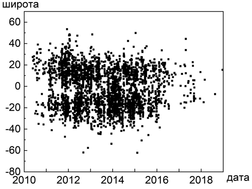 Рис. 4. Зависимость средней широты димминга от времени за 2010–2018 гг.