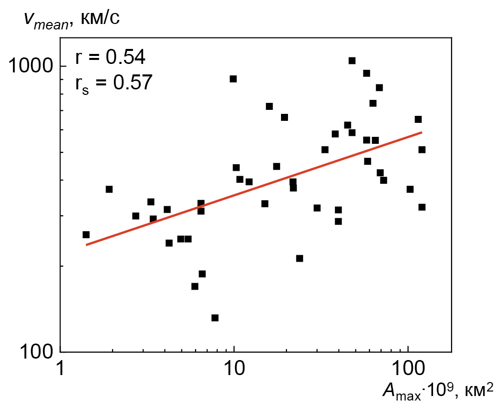 Рис. 5. Зависимость средней скорости КВМ в коронографе от максимальной площади димминга для всех соответствующих КВМ и диммингов. Прямая обозначает линейную зависимость логарифмов параметров.