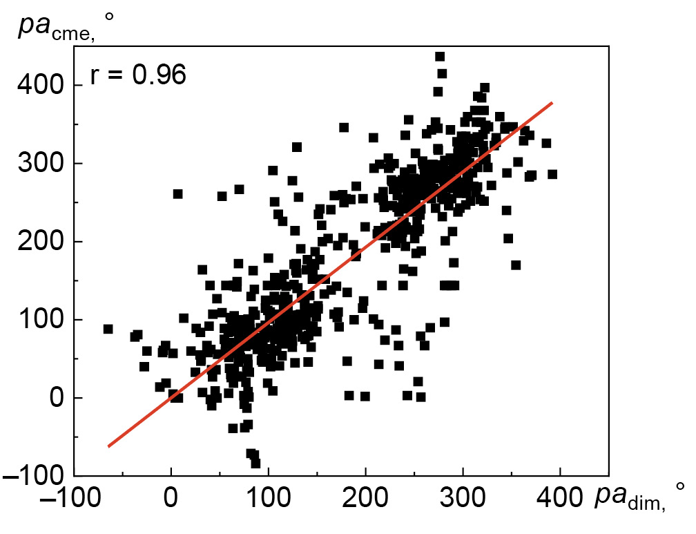 Для исследования пространственной связи димминга и КВМ были выбраны такие параметры, как угол направления на центр димминга и позиционный угол КВМ. Коэффициент корреляции Пирсона между углами димминга и КВМ составляет 0.96 (рис. 7). Так как угол периодичен, некоторые точки сдвинуты на 360°. Полученный результат связан с алгоритмом отбора — при сопоставлении событий КВМ и диммингов проводится проверка по углу, разность должна быть не более 90°. Следует отметить, что у большинства событий (72%) различие углов лежит в пределах 45°.