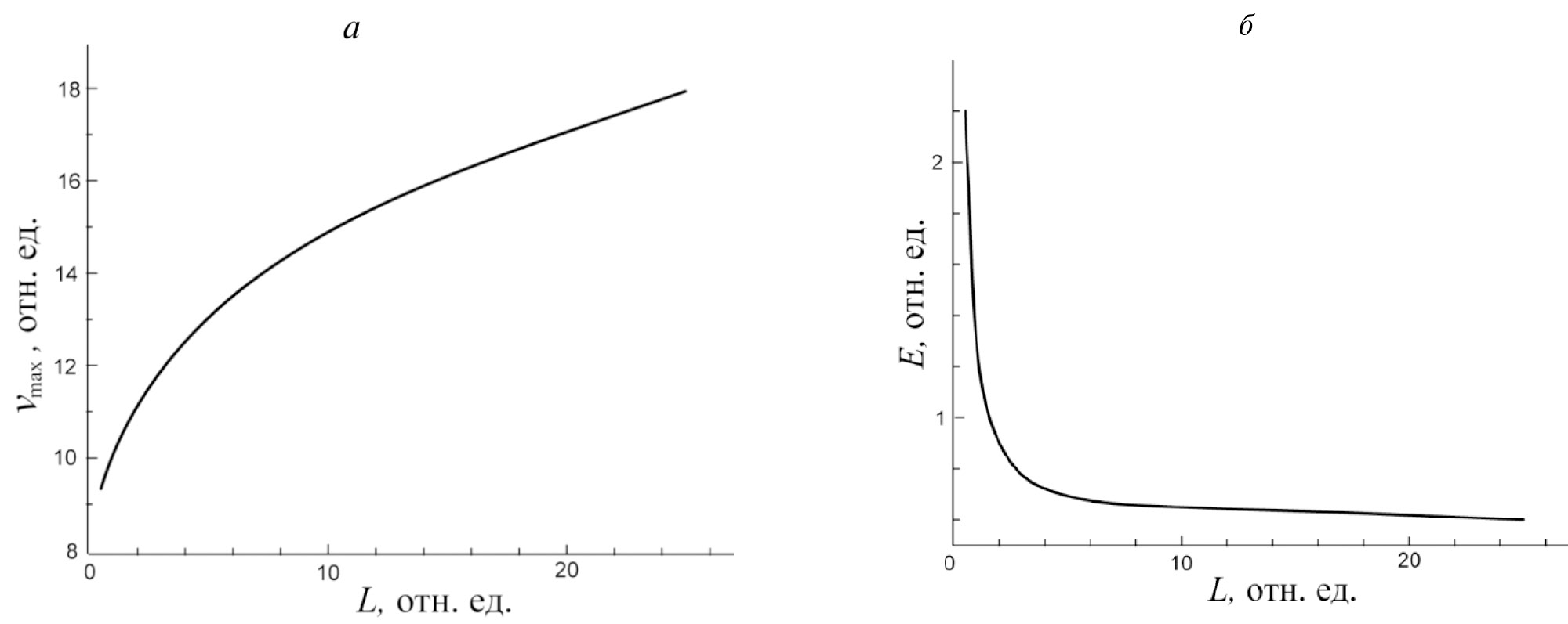 Рис. 2. Зависимость максимальной скорости, достигаемой магнитным жгутом при эрупции vmax (а), и величины индукционного электрического поля в нулевой точке E (б) от расстояния L между его основаниями, вмороженными в фотосферную плазму.