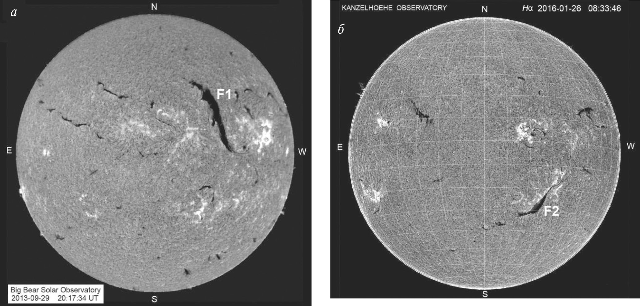 Рис. 3. Изображения полного солнечного диска в линии Hα 29 сентября 2013 г. (а) и 26 января 2016 г. (б) с крупными спокойными волокнами F1 и F2 незадолго до начала их эрупций (б), полученные в обсерваториях Big Bear Solar Observatory и Kanzelhoehe Solar Observatory.