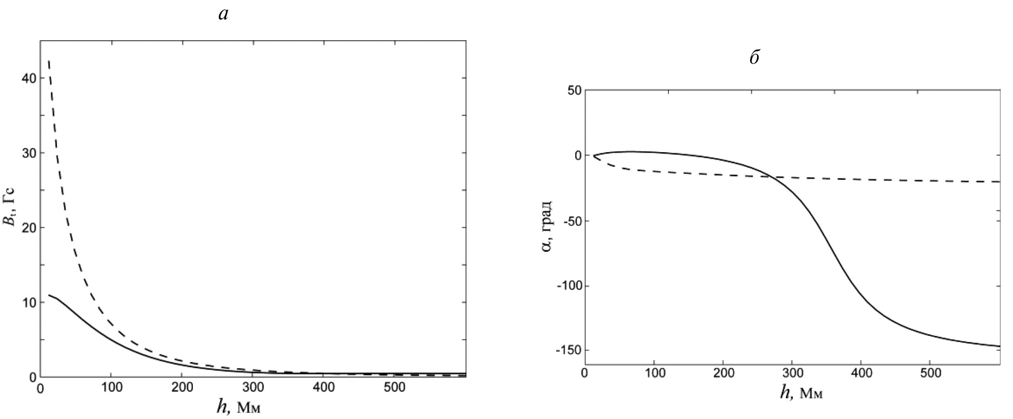 Рис. 4. Зависимость величины горизонтальной компоненты потенциального магнитного поля Bt над серединой волокна от высоты над фотосферой h (а), и изменение направления α этой компоненты с высотой (б). Сплошные линии соответствуют волокну F1, а штриховые линии — волокну F2.