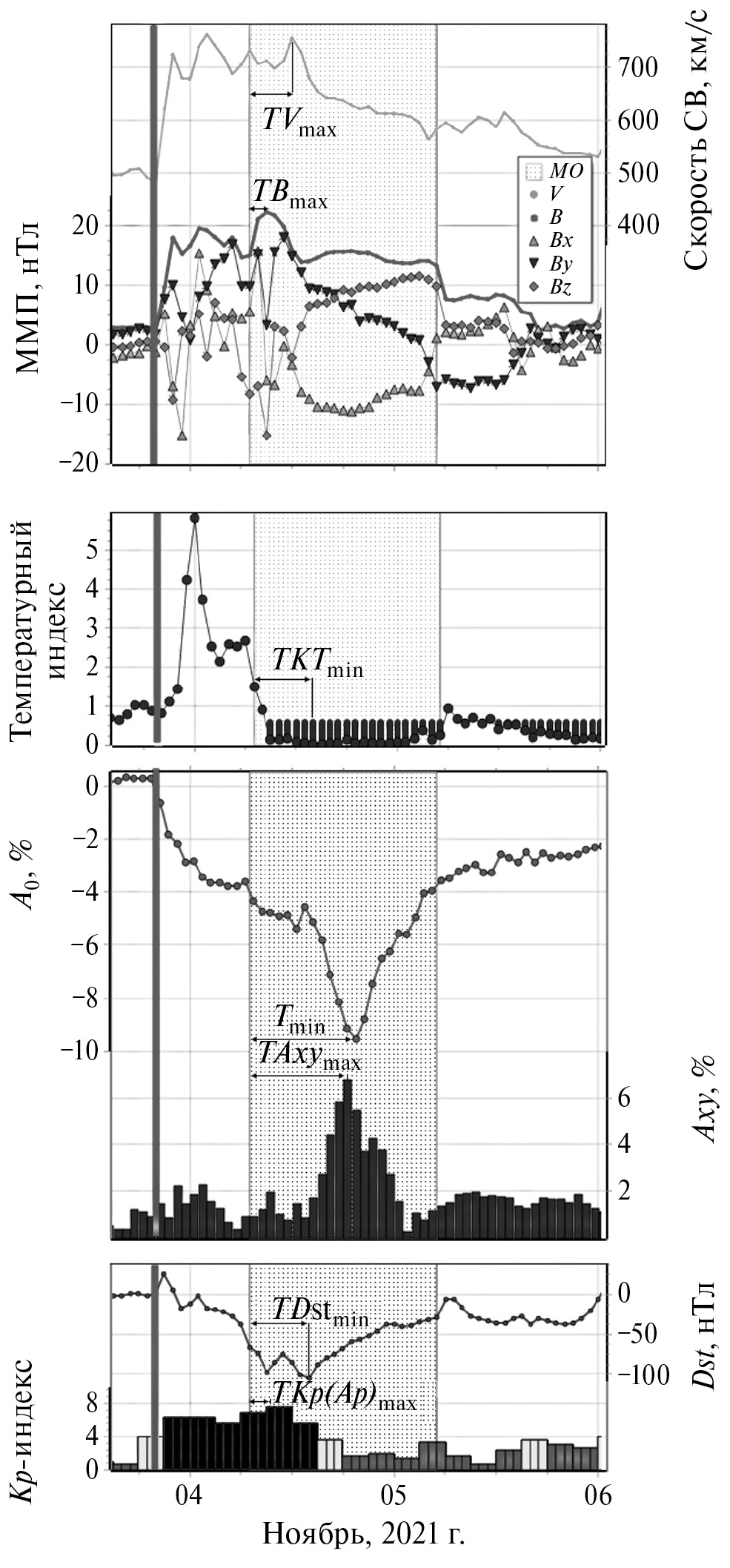 Для примера был выбран самый значительный Форбуш-эффект за последние 10 лет. Это событие было зарегистрировано 3—5 ноября 2021 г., когда орбиты Земли достиг быстрый межпланетный корональный выброс массы, источником которого был КВМ (в 02:48 UT, V0 = 1473 км/с), ассоциированной с солнечной вспышкой M1.7 (с координатами N14E01) 2 ноября 2021 г. В результате был зарегистрирован ФЭ с амплитудой 9.8% и Axymax = 6.77%. Во время этого события наблюдалась очень большая магнитная буря (Kpmax = 8–, Dstmin = –105 нТл) – одна из наиболее мощных в текущем солнечном цикле, а также значительные экстремальные параметры межпланетной среды: Vmax = 762 км/с и Bmax = 22.3 нТл. На рис. 1 указаны моменты регистрации экстремальных значений всех перечисленных параметров. В показанном событии границы магнитного облака указаны в соответствии с данными интернет-каталога (http://www.srl.caltech.edu/ACE/ASC/DATA/level3/icmetable2.htm). Продолжительность данного МО – 22 ч, в течение этого периода амплитуда вариаций КЛ составила 5.8%, максимальное значение скорости СВ (757 км/с) внутри МО было зарегистрировано через 5 ч после начала облака, а максимальное значение ММП (22.3 нТл) – через 2 ч.