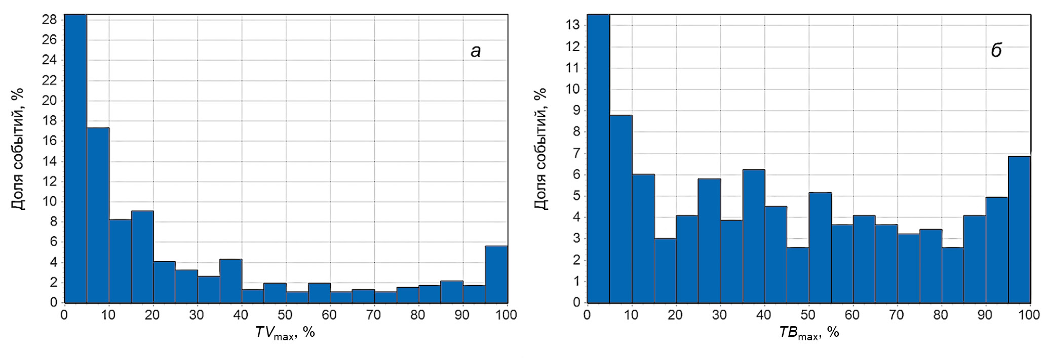 Рис. 3. Распределения максимальных значений скорости СВ (а) и индукции ММП (б) внутри МО в межпланетных возмущениях без взаимодействия со следующим событием.