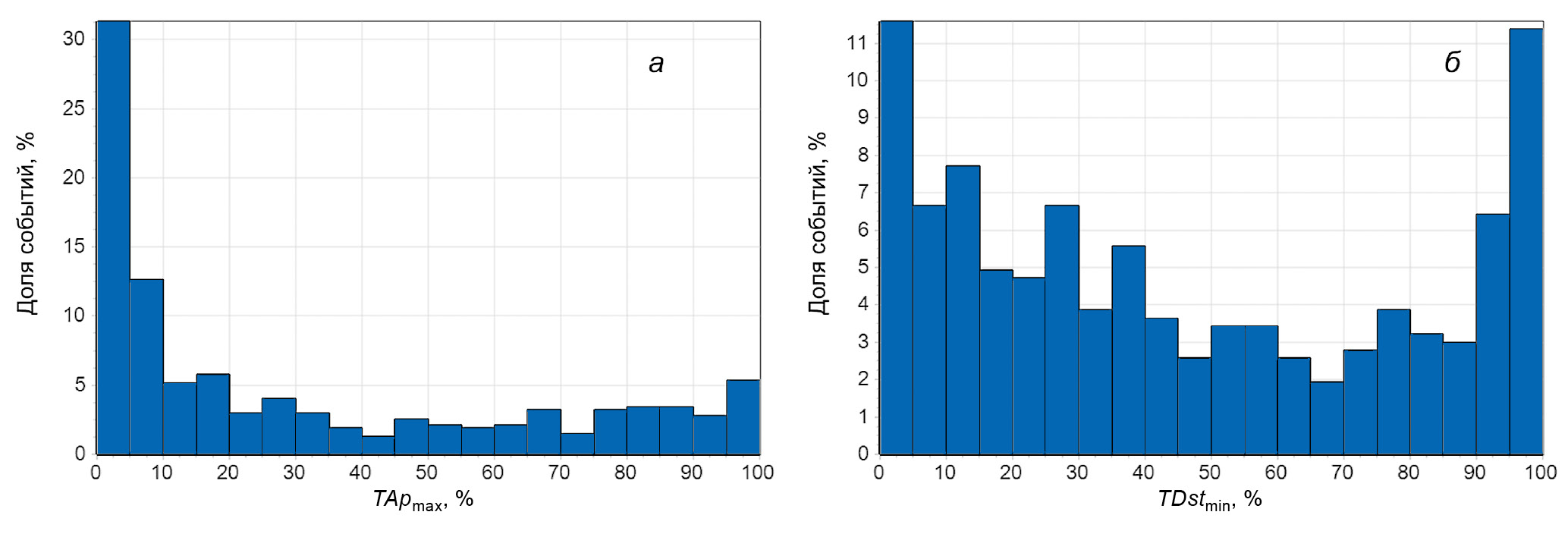 Далее мы рассмотрели временные распределения экстремальных значений геомагнитных индексов внутри МО (см. рис. 4). Во многих исследуемых событиях (44%) максимальный Ap-индекс регистрировался в первые 10% времени (см. рис. 4а). И если рассмотреть только те события, в которых TBmax ≤ 10% (108 событий), то в 83% случаев Apmax наблюдается именно в начале МО (в первые 20% времени –первые четыре столбца гистограммы). Это вполне ожидаемый результат из-за тесной связи геомагнитной активности и величины ММП в межпланетном возмущении (напр., [Tsurutani and Gonzalez, 1997]). Однако в распределении минимального значения Dst-индекса наблюдается несколько иная картина (см. рис. 4б): есть два явно выраженных пика: регистрация минимальных значений в самом начале МО (85 событий, в первые 10% времени) и в самом конце МО (83 события, в последние 10% времени). Мы дополнительно рассмотрели те магнитные облака (21 событие), в которых минимальное значение Dst-индекса было зарегистрировано в самом конце МО (в последние 10% времени), а максимальное значение Ap-индекса, наоборот, в первые часы МО (в первые 10% времени). Все эти события можно разделить на две группы: 1) 13 МО, внутри которых вариации Ap и Dst индексов были незначительны (Kpmax ≤ 4, среднее |Dst_range| ≈ 26 нТл, где Dst_range –это изменение Dst индекса внутри МО); 2) 8 МО, во время прохождения которых были зарегистрированы магнитные бури, и величина Kpmax в начале события оказалась немного больше, чем в конце. Таким образом, выявленная для небольшого количества событий особенность объясняется флуктуациями геомагнитных индексов при сравнительно равномерном их распределении внутри МО.
