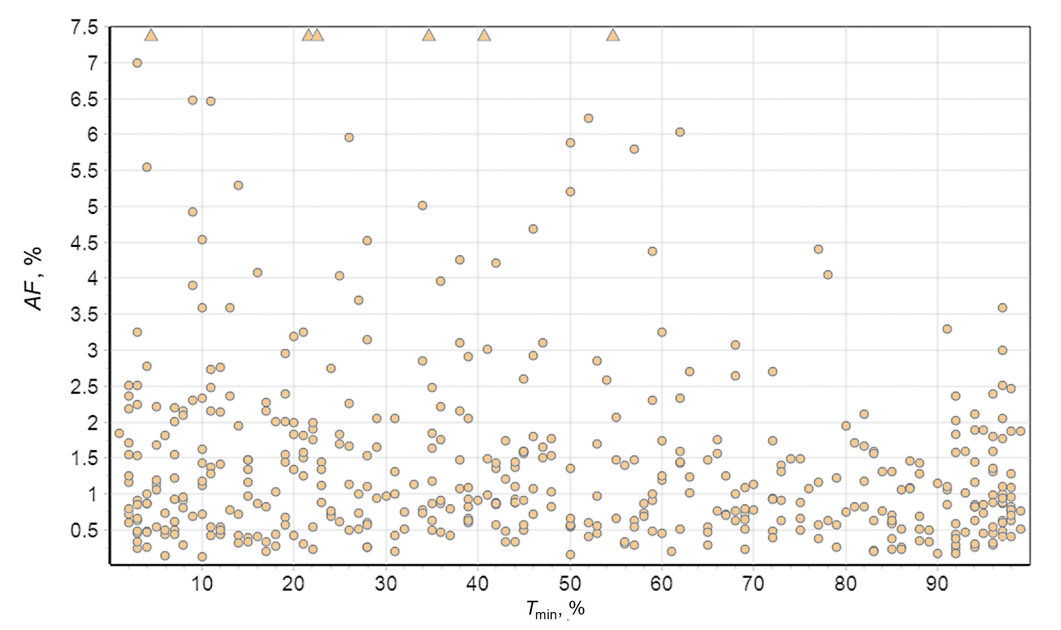 Далее мы рассмотрели распределение времени достижения минимума плотности КЛ внутри МО (рис. 5). Из соображений масштаба на рис. 5 не приведены события с амплитудами >7% (для частиц с жесткостью 10 ГВ), но треугольниками указаны времена регистрации максимальных вариаций плотности КЛ внутри МО. Эти ФЭ были зарегистрированы 17.02.1978 г., 06.11.2001 г., 30.10.2003 г., 28.10.1991 г., 29.10.2003 г. и 26.07.2004 г. с амплитудами внутри МО 16.9; 10.0; 10.1; 9.5; 11.6; 11.0 % соответственно.