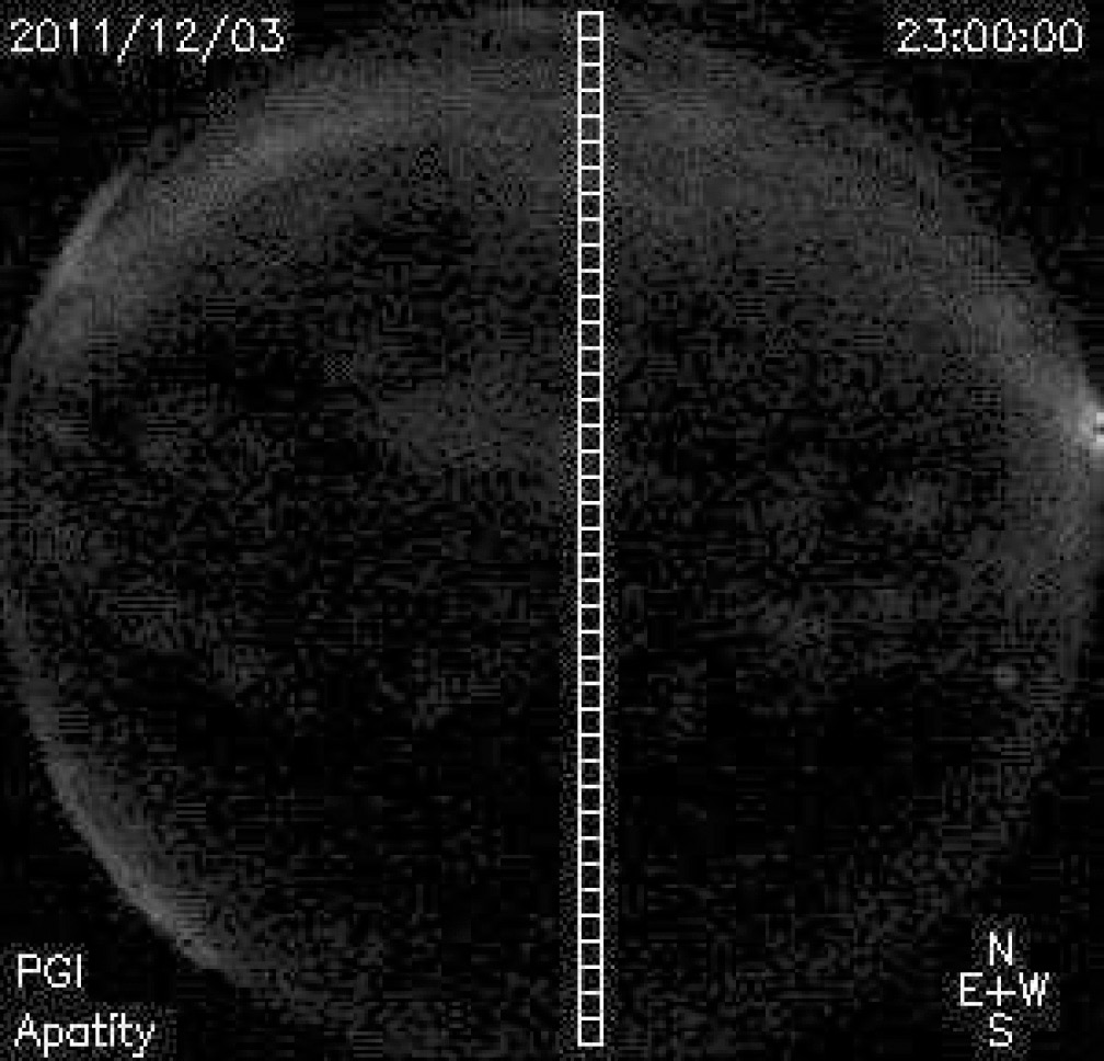 По наземным данным (обсерватории в Лопарской и в Ловозеро) было отмечено, что после ~21:20 UT возникает отрицательная бухта Н-компоненты магнитного поля, что характерно для начала суббуревой активности [Akasofu, 1968], которая остается отрицательной до ~01:00 UT 04.12.2011 г., причем в моменты 22:46 UT и 23:23 UT особенности в изменении магнитного поля соответствуют локальным уярчениям северной авроральной дуги. Кроме того, по наземным данным обсерватории Ловозеро заметно увеличение геомагнитных пульсаций Pi2, которые традиционно сопровождают вспышки полярных сияний [Намгаладзе и др., 1967]. Однако моменты уярчения дискретной дуги и появления геомагнитных пульсаций в данном случае не совпадают точно, поскольку активизация сияний началась западнее обсерваторий. В нашем случае увеличение низкочастотных пульсаций происходило в моменты повышенного высыпания заряженных частиц в ионосферу и максимального значения индекса SME (~23:15 − 00:45 UT).