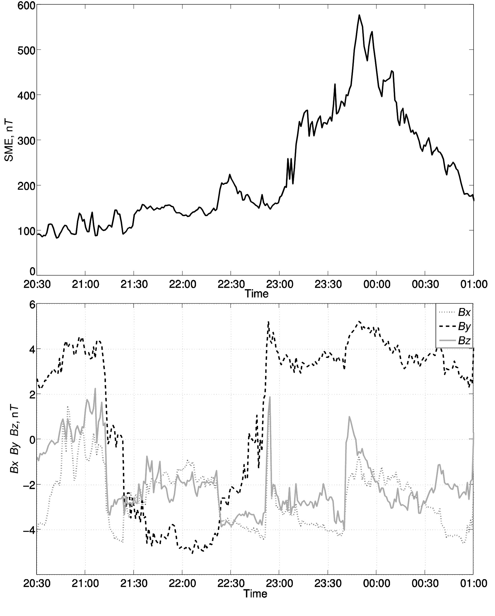 На рис. 3 показано изменение геомагнитного индекса SME [Newell and Gjerloev, 2011], который характеризует авроральную активность (верхняя панель) во время геомагнитного события 03.12.2011 г. (формулы расчетов AE и SME индексов геомагнитной возмущенности на высоких широтах совпадают). Хорошо заметно, что после 23 часов началось существенное повышение значений индекса SME почти до 600 нТл, и именно в это время наблюдались наиболее интенсивные полярные сияния, как следует из рис. 1. На нижней панели рис. 3 представлены OMNI данные [Gjerloev, 2012], отражающие изменения компонент межпланетного магнитного поля (ММП), где ММП Bz показан сплошной, ММП Bx − штрихпунктирной, а ММП By − пунктирной линией в системе GSM (geocentric solar magnetospheric coordinates). В системе GSM ось X направлена из центра Земли на Солнце, ось Z лежит в плоскости земного магнитного диполя и оси X, а ось Y завершает правостороннюю систему координат. Как явствует из рис. 3, ММП Bz изменил свою ориентацию на южное направление после 21:20 UT и оставался отрицательным до 01:00 UT с небольшими “всплесками”, когда на очень короткое время ММП Bz принимало положительные значения. Для такой ориентации ММП характерно магнитное пересоединение на дневной стороне магнитопаузы и последующее расширение полярной шапки. Это расширение проявляется в экваториальном движении аврорального овала после 23:00 UT на кеограммах на рис. 1 (панель 2), когда резко увеличились значения ММП By, то есть общая мощность межпланетного магнитного поля и индекса SME. Таким образом, предварительная фаза суббуревого возмущения началась после поворота Bz к югу в 21:20 UT, а взрывная фаза суббури (увеличение SME > 300 нТл), стимулированная поворотом (“пичком”) около 22:50 UT, началась с задержкой ∼20 минут в 23:10 UT.