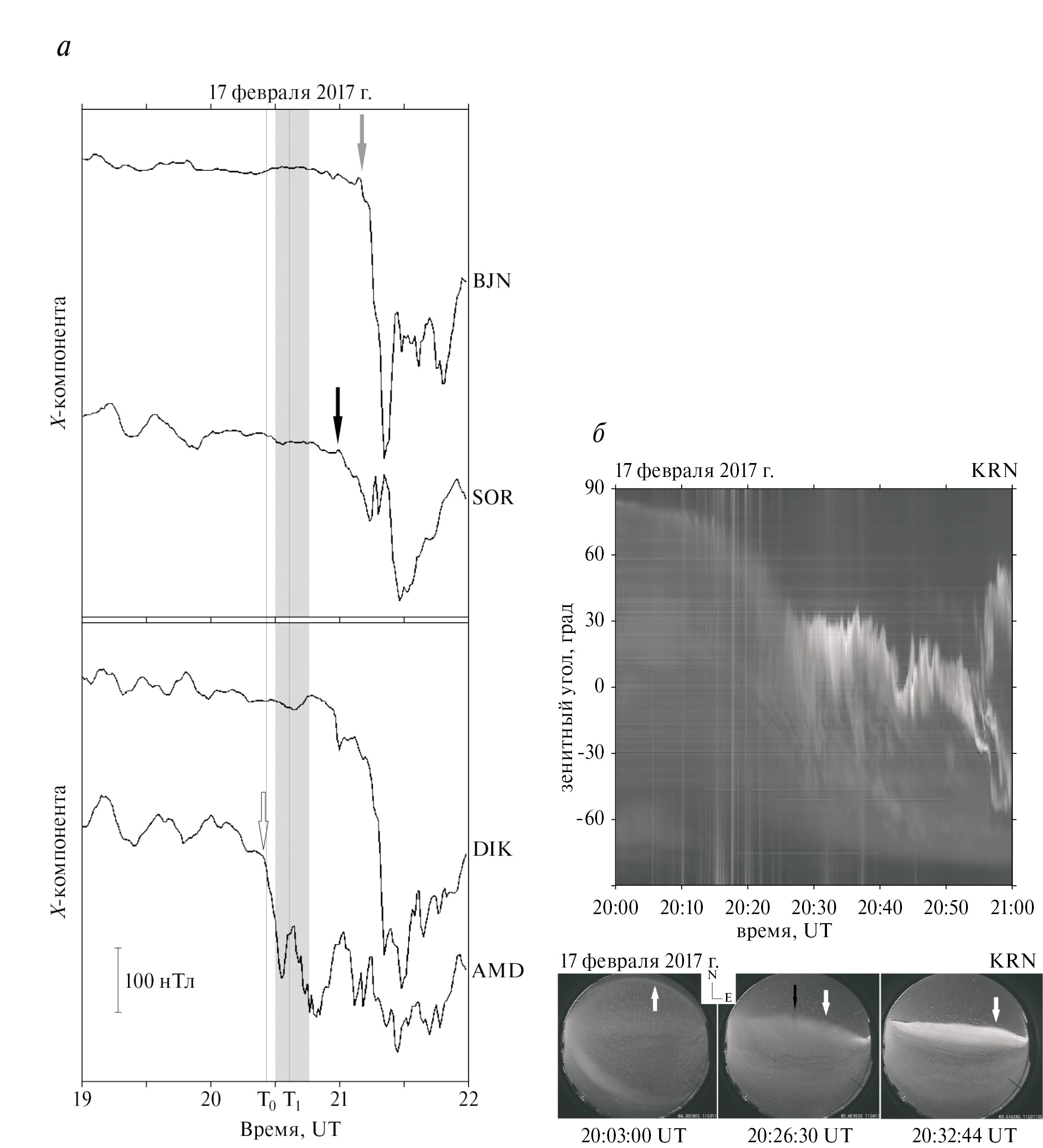 Рис. 1. Интервал наблюдения волн светимости в предсуббуревой дуге (выделен серым цветом) в контексте суббуревой активности: (а) — магнитные возмущения в области, включающей область оптических наблюдений. Длинными стрелками белого, черного и серого цвета отмечены начала суббурь в AMD, SOR и BJN соответственно. Моменты уярчения предсуббуревой дуги и появления на ней вихреобразных структур обозначены Т0 и Т1 соответственно; (б) — кеограмма и серия кадров, демонстрирующие эволюцию сияний над KRN. Дрейфующая к экватору предсуббуревая дуга показана короткой белой стрелкой. Короткая черная стрелка указывает на изгиб границы диффузной дуги, по которому происходил подбор высоты.