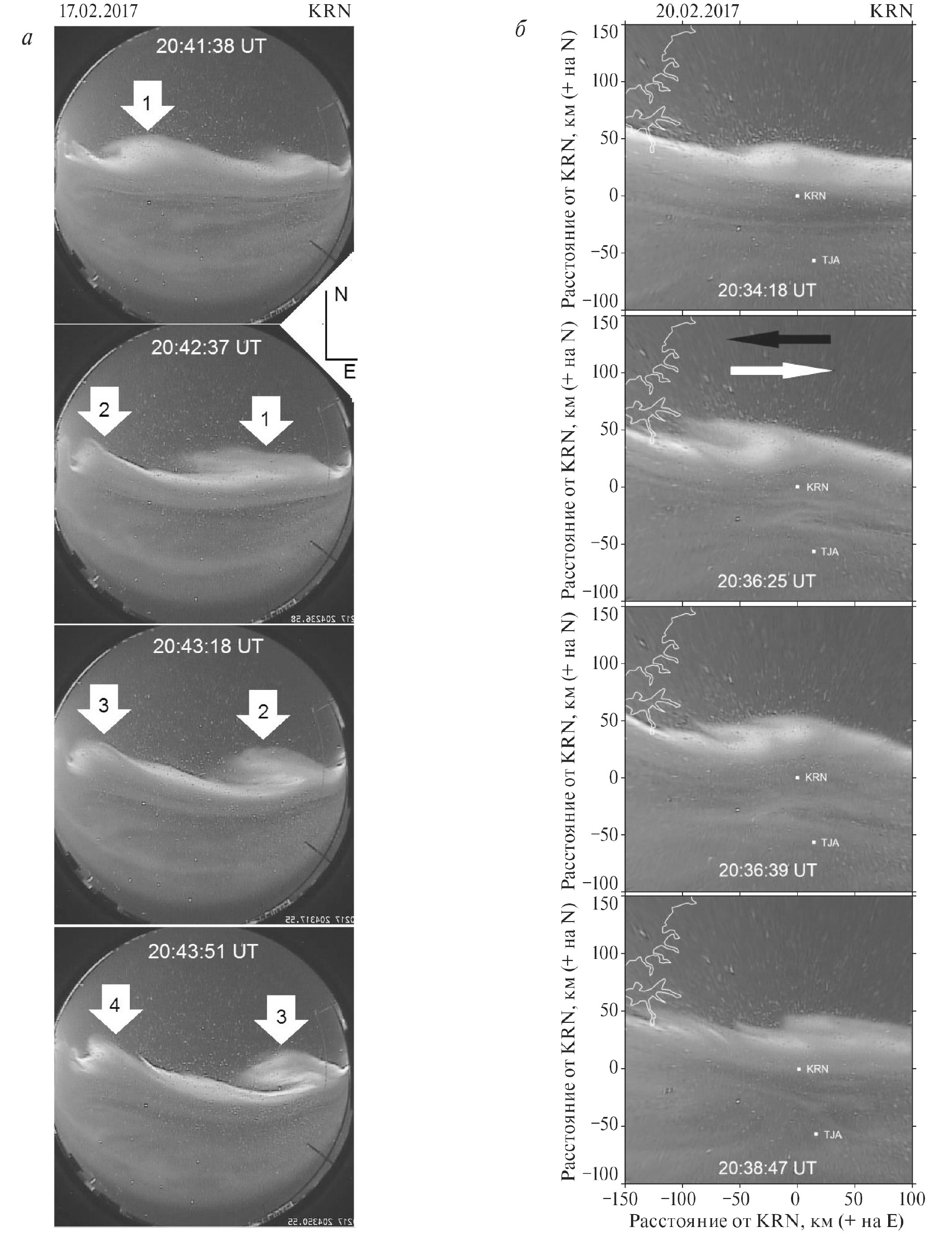 В момент времени ~20:12 UT находящаяся у самого северного края поля зрения камеры KRN дуга начала смещаться к югу. Момент начала движения точно определить не удалось, так как дуга располагалась у самого горизонта поля зрения. Тем не менее движение отслеживается по кеограмме и по серии кадров на рис. 1б. Такой характер поведения дуги является типичным для подготовительной фазы суббури. За несколько минут до появления авроральных вихрей дуга остановилась недалеко от зенита KRN, яркость в ней увеличилась (правый кадр на рис. 1б). Момент уярчения обозначен на магнитограммах как Т0. Сравнение с предшествующим кадром показывает, что уярчение дуги произошло не одновременно по всей ее длине, а распространялось с востока на запад и было обусловлено, вероятно, началом обычной суббури к востоку от области оптических наблюдений. На кеограмме на рис. 1б видно, что яркость свечения увеличилась не только в дуге, но и к экватору от нее, в области пульсирующего и диффузного свечения.