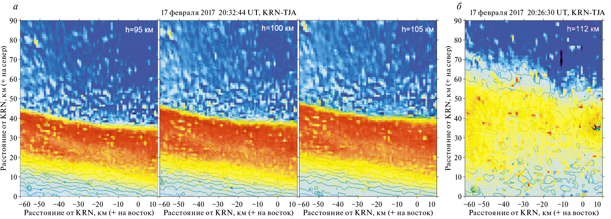 Положение дуги вблизи зенита KRN как до, так и после момента ее уярчения (средний и правый кадры на нижней панели, см. рис. 1б) представляет благоприятную ситуацию для проведения триангуляционных измерений ее высоты при помощи имеющихся в нашем распоряжении двух камер, поскольку в эти моменты дуга находится в их общем поле зрения. Снимки камер накладывают один на другой и, меняя высоту свечения, добиваются совпадения выбранных фрагментов сияний. Наложение фрагмента дуги, сфотографированной с двух позиций, демонстрируется на рис. 7а для трех значений высоты. Здесь в псевдоцвете представлен снимок камеры KRN, в то время как распределение свечения на снимке камеры TJA передается семейством изолиний. Такое представление делает более удобным совмещение авроральных структур при наложении.