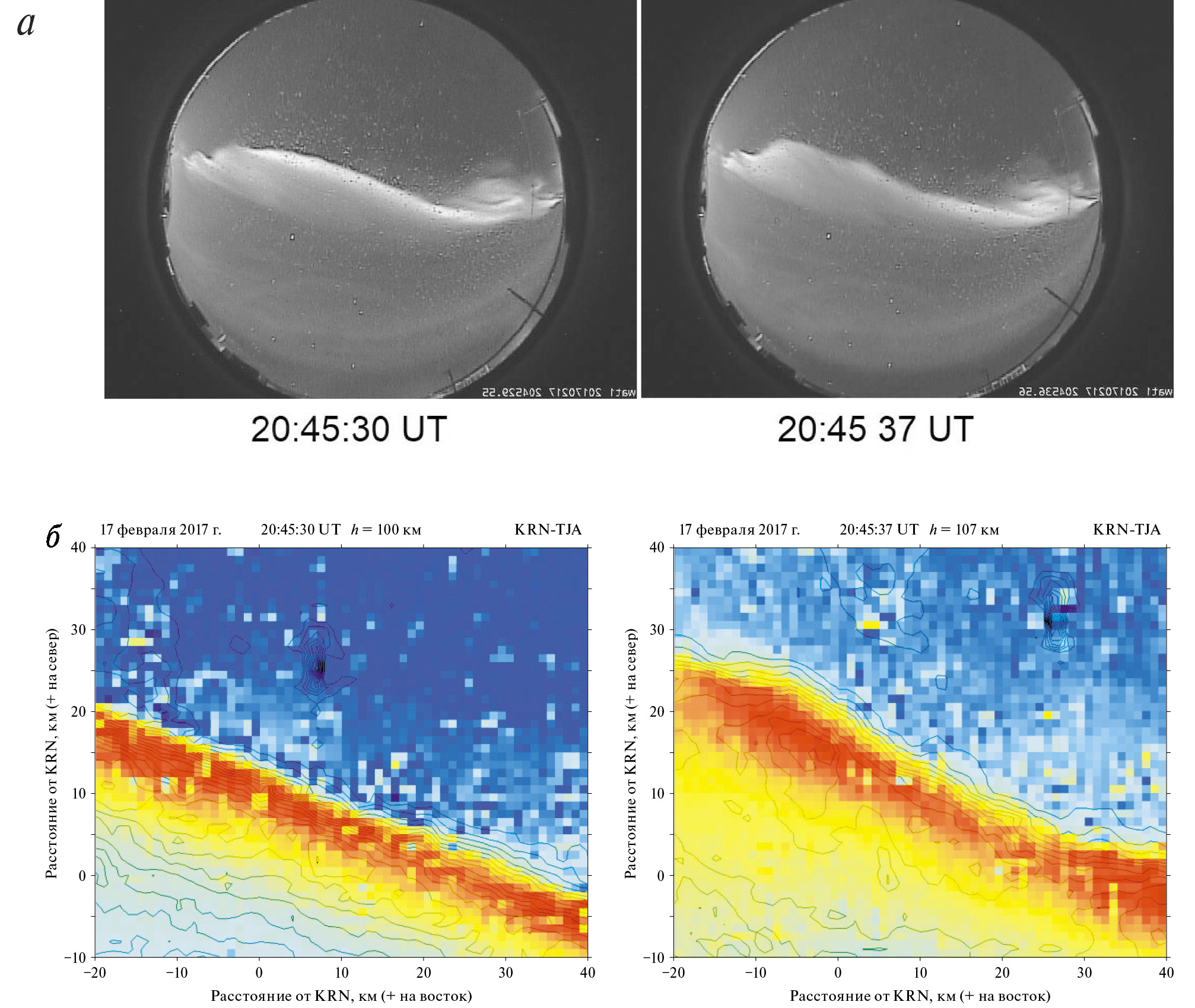 Данные камер KRN и TJA были взяты с сайта Национального института полярных исследований Японии (NIPR, https://scidbase.nipr.ac.jp/) до его реконструкции и на момент подготовки статьи находились в свободном доступе. Мы признательны проекту PsA, в рамках которого функционировали камеры и данные размещались в сети Интернет. Координаты спутников определялись при помощи онлайн процедуры SSC 4D Orbit Viewer (https://sscweb.gsfc.nasa.gov). Пакет программ для триангуляционных измерений подготовлен Б. Густавссоном (Университет Тромсе). Данные сети IMAGE доступны на сайте (https://space.fmi.fi/MIRACLE). Данные магнитометров AMD и DIK предоставлены Калишиным А.С. (ААНИИ). ВС благодарит Митрофанова В.Н. (ПГИ) за помощь в работе с оптическими данными.