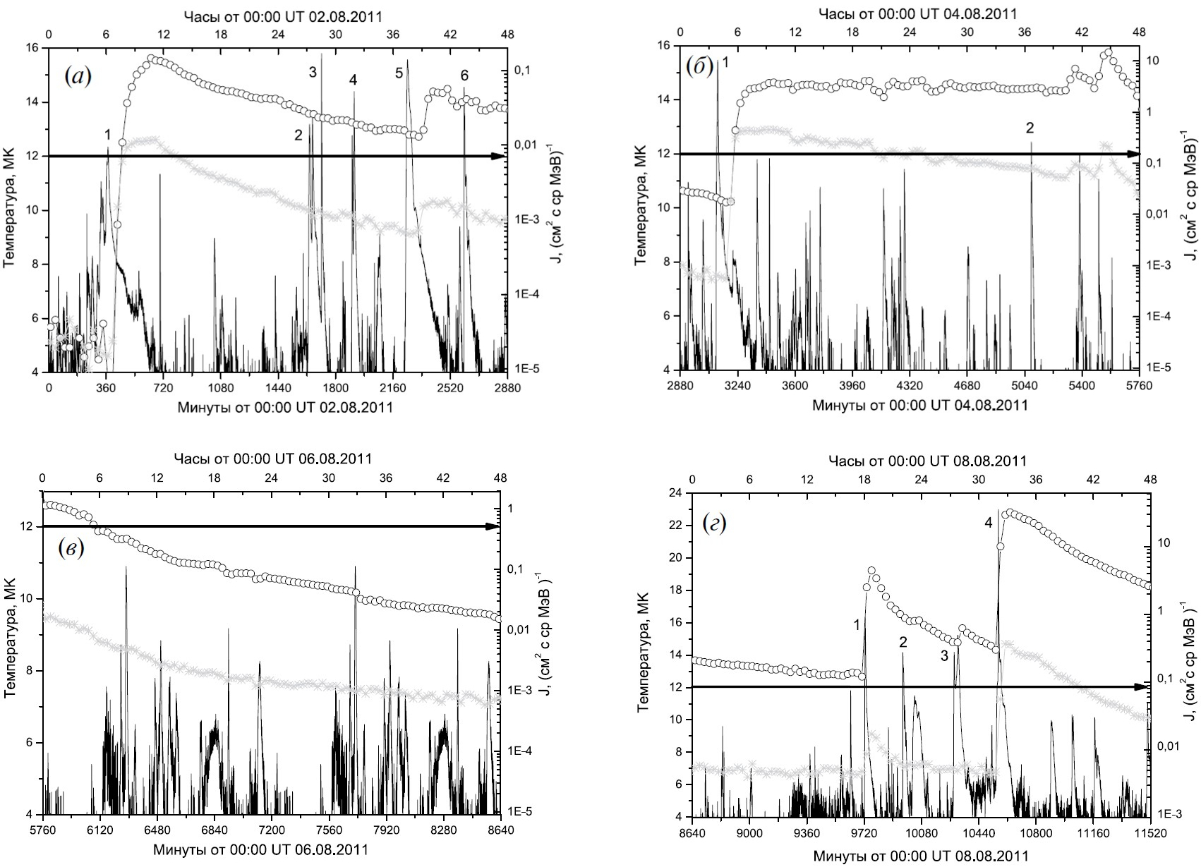 Рис. 2. Обозначения как на рис. 1. Период со 2 по 9 августа 2011 г. разбит на отрезки по 2 дня: (а) 2—3 августа, (б) 4—5 августа, (в) 6—7 августа и (г) 8—9 августа. Верхняя горизонтальная шкала — часы, а нижняя — минуты. Цифры на каждой панели соответствуют номерам вспышек в табл. 1—3.
