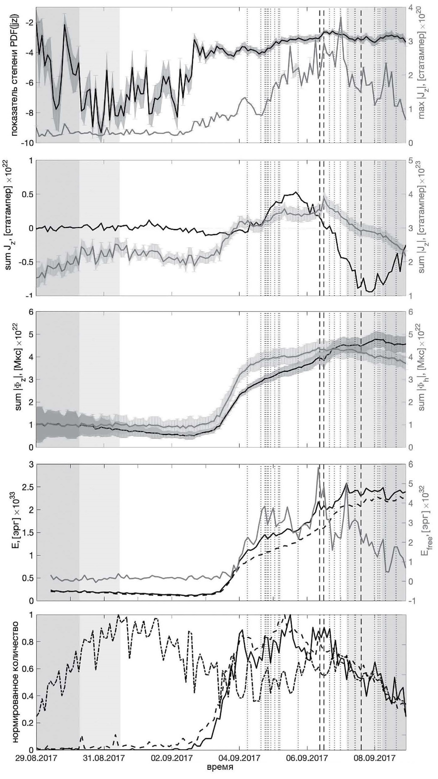 Кривые эволюции (зависимости от времени) перечисленных параметров с ошибками их вычисления, основанными на информации об ошибках компонент вектора магнитного поля (в данных SHARP), представлены на рис. 1 для АО 11158, на рис. 2 для АО 11675, на рис. 3 для АО 12673. Отметим, что ошибки магнитных энергий не приводятся по причине практической невозможности их расчета. На рис. 1—3 первая (верхняя) панель: показатель степени PDF(|jz|) (черная кривая) и максимум абсолютного значения вертикального тока max|Jz| (серая кривая). Вторая панель: знаковая (черная кривая) и беззнаковая (серая кривая) суммы вертикального тока sumJz и sum|Jz| соответственно. Третья панель: суммарные беззнаковые потоки вертикального (черная кривая) и горизонтального (серая кривая) магнитного поля sum|Φz| и sum|Φh|, соответственно. Четвертая панель: энергия нелинейного бессилового Enlfff (черная сплошная кривая) и потенциального Epotf (черная пунктирная кривая) магнитного поля, свободная магнитная энергия Efree (серая сплошная кривая). Пятая панель: нормированное количество островов (отдельных участков АО) с плотностью вертикального тока |jz| > 3×103 статампер/см2 (штрихпунктирная кривая), |jz| >9×103 статампер/см2 (пунктирная кривая) и |jz| > 18 · 103 статампер/см2 (сплошная кривая). Цвета кривых соответствуют цветам осей ординат, на которых показаны их значения. Серые участки на графиках выделяют те интервалы времени, где достоверность значений параметров сомнительна из-за удаленности центра АО от центрального меридиана (в диапазоне гелиодолгот 45°–60° — светло-серый цвет, выше 60° градусов — темно-серый цвет). Вертикальные точечные и пунктирные линии показывают время пика вспышек М и Х классов соответственно.