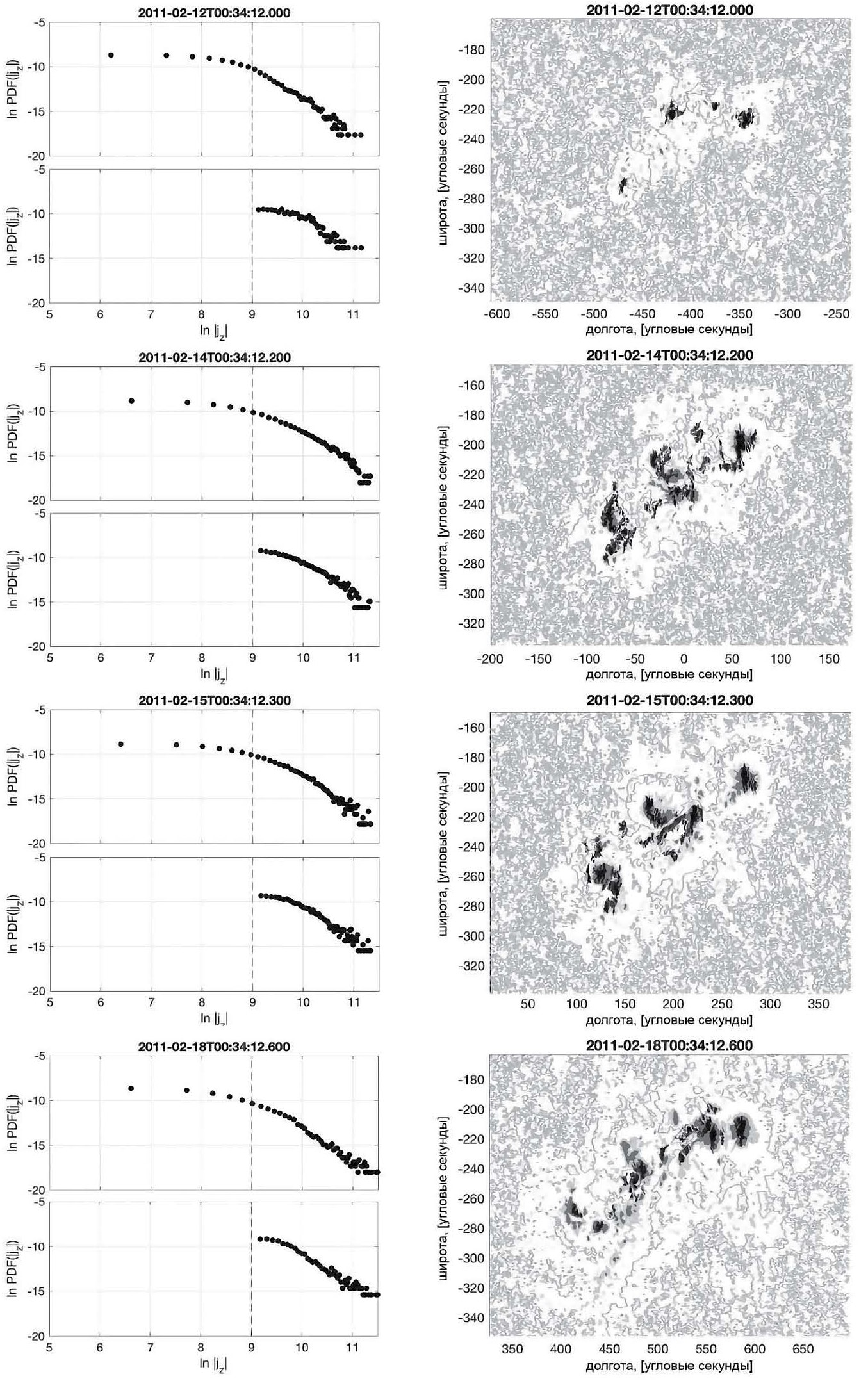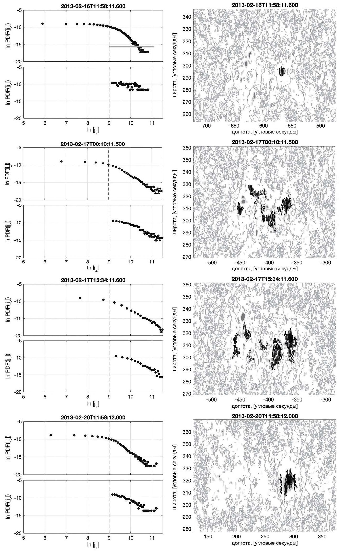 На левых панелях рис. 4—6 можно видеть характер изменения PDF(|jz|) с ходом эволюции АО, а именно появление степенного “хвоста” и уменьшение его наклона (уменьшение абсолютного значения индекса степени) в процессе возрастания магнитного потока, что подтверждает формирование в АО большего количества участков с сильными токами на этих этапах. Для каждого момента времени приведены два распределения PDF(|jz|): верхнее — для всей рассматриваемой АО, нижнее — только для обозначенных островов сильных токов.