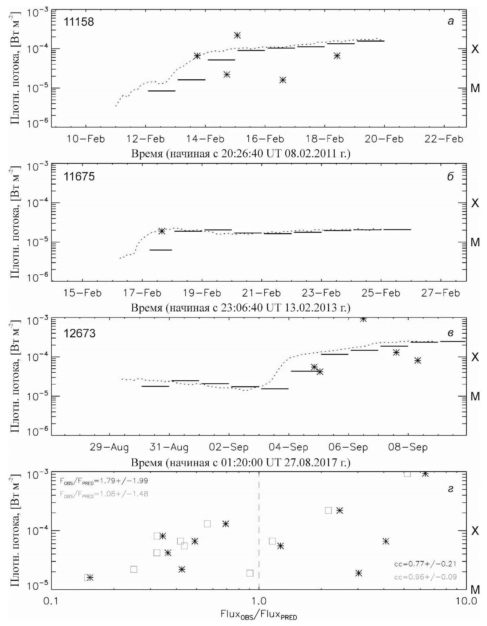 На рис. 9 пунктирной линией показана вычисленная на основе выражения (11) пиковая плотность потока F8(t) вероятной вспышки в канале GOES1—8 Å ля АО 11158 (а), 11675 (б) и 12673 (в) для рассматриваемых интервалов времени с шагом 2 ч. Звездочками отмечены пиковые плотности потока (т. е. классы GOES) самых мощных вспышек (классов M и X, события более низких классов не рассматриваются) за каждые сутки, произошедших в этих АО. Можно видеть, что в целом наблюдаемые пиковые плотности потока лежат вблизи вычисленных кривых с некоторым разбросом. Отношения наблюдаемых и вычисленных пиковых плотностей потока, Fobs/Fpred, показано на рис. 9г серыми квадратами. Значения отношений Fobs/Fpred находятся в пределах от 0.15 до 5.2, т. е. в пределах одного порядка величины в обе стороны относительно единицы. Среднее значение 1.08, стандартное отклонение 1.48. Интересно отметить высокий коэффициент корреляции 0.96±0.09 между наблюдаемой пиковой плотностью потока вспышки Fobs и отношением плотностей потока Fobs/Fpred, другими словами, чем выше регистрируемый максимальный класс вспышки, тем более заниженным получается класс вспышки из расчета.