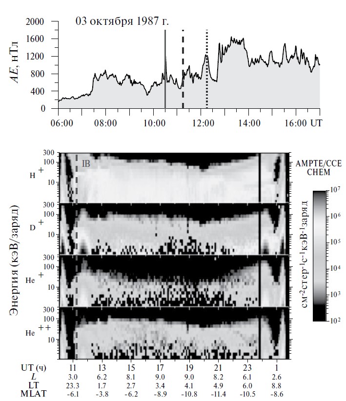 Рис. 1. Вверху: изменение индекса АЕ со временем. Сплошная линия — вспышка АЕ. Штриховая линия — время регистрации границы инжекции, точечная линия — время регистрации ПД на ст. Якутск. Внизу: спектрограммы “энергия — время” для различных ионов, зарегистрированных прибором CHEM на спутнике AMPTE/CCE 3—4 октября 1987 г. Штриховой линией отмечена граница инжекции ионов (IB).