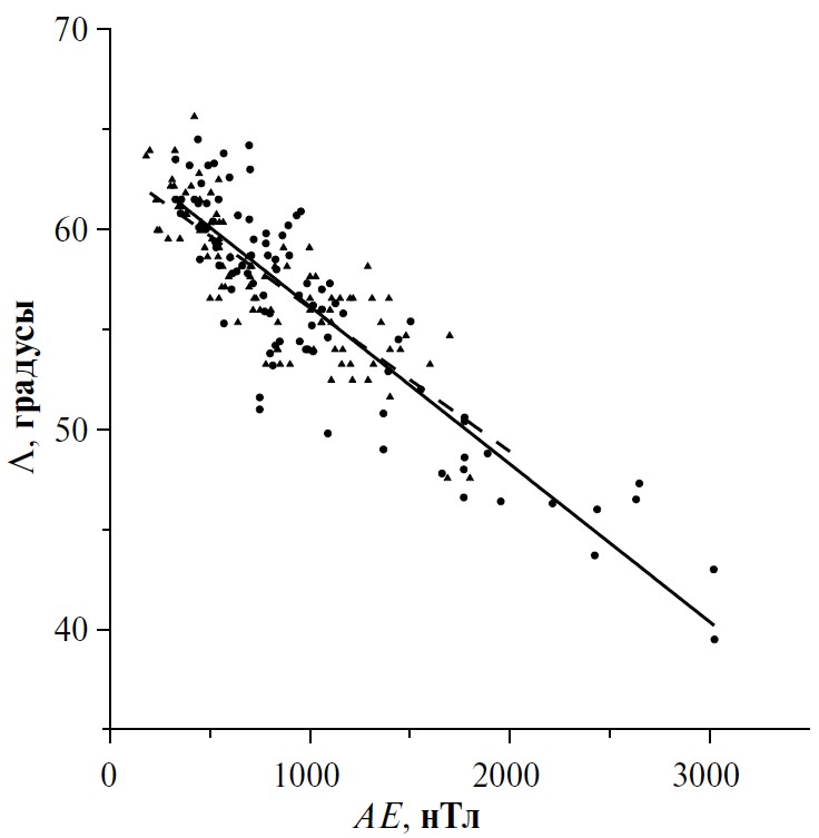Рисунок 2 воспроизводит заключительный рисунок из указанной работы и демонстрирует совпадение зависимостей. Зависимость инвариантной широты (Λeq) экваториальной границы ПД от величины всплеска АЕ-индекса аппроксимируется линейной функцией, показанной сплошной линией на рис. 2: