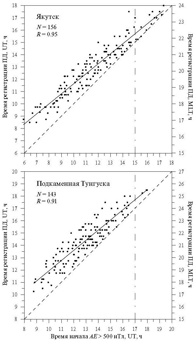 На рис. 3 рассмотрены события, для которых время задержки появления ПД над станциями относительно начала вспышки суббури не превышает трех часов. Эмпирически было установлено, что на станциях Якутск и Подкаменная Тунгуска, которые находятся на магнитной оболочке L ≈ 3, ПД обычно наблюдается при величине АЕ ≥ 500 нТл. Поэтому рассматривались изолированные вспышки АЕ ≥ 500 нТл. На рис. 3 указаны числа рассмотренных событий (N) и коэффициенты корреляции (R) аппроксимирующих прямых: UTПД = 0.81UTAE. + 3.5 для ст. Якутск и UTПД = 0.82UTAE. + 3.7 для ст. Подкаменная Тунгуска.