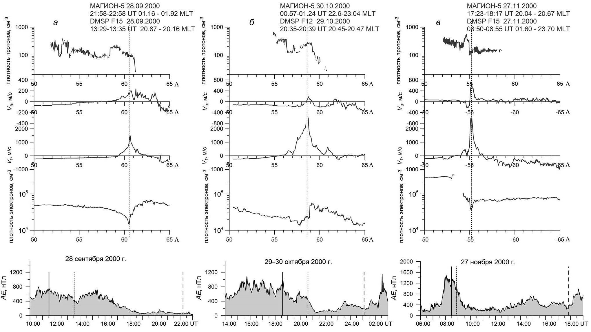 На рис. 4 показаны профили плотности протонов в зависимости от инвариантной широты (Λ), полученные на спутнике МАГИОН-5 28 сентября 2000 г., 30 октября 2000 г. и 27 ноября 2000 г. Под ними на этом рисунке приведены скорости ионов и плотность электронов в верхней ионосфере на высоте около 850 км, измеренные на спутниках F15 и F12. Вертикальной штриховой линией отмечена максимальная скорость западного дрейфа ионов в ионосфере, что соответствует пересечению спутником ПД. На нижних панелях показаны изменения АЕ-индекса в соответствующие периоды измерений на спутниках.