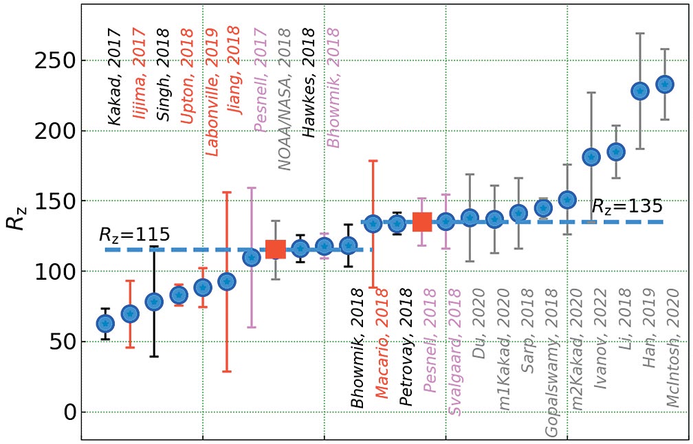 Рис. 1. Разброс прогнозируемого максимального числа солнечных пятен для 25-го солнечного цикла. Квадраты — прогнозируемые значения по данным NOAA/NASA [NASA/NOAA, 2019] и работы [Pesnell et al., 2018].