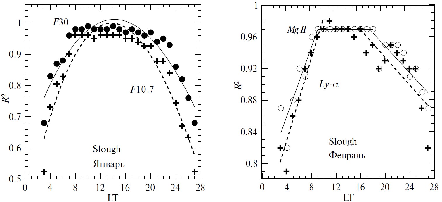 Типичные примеры суточных вариаций величины R2 в январе и феврале по данным ст. Slough при использовании индексов MgII, Ly-a, F30 и F10.7 приведены на рис. 1.