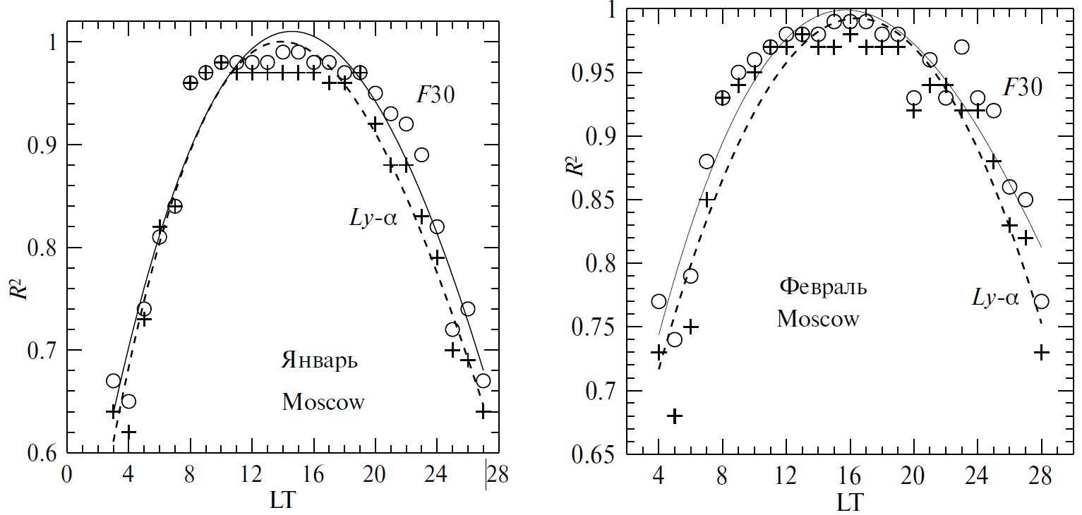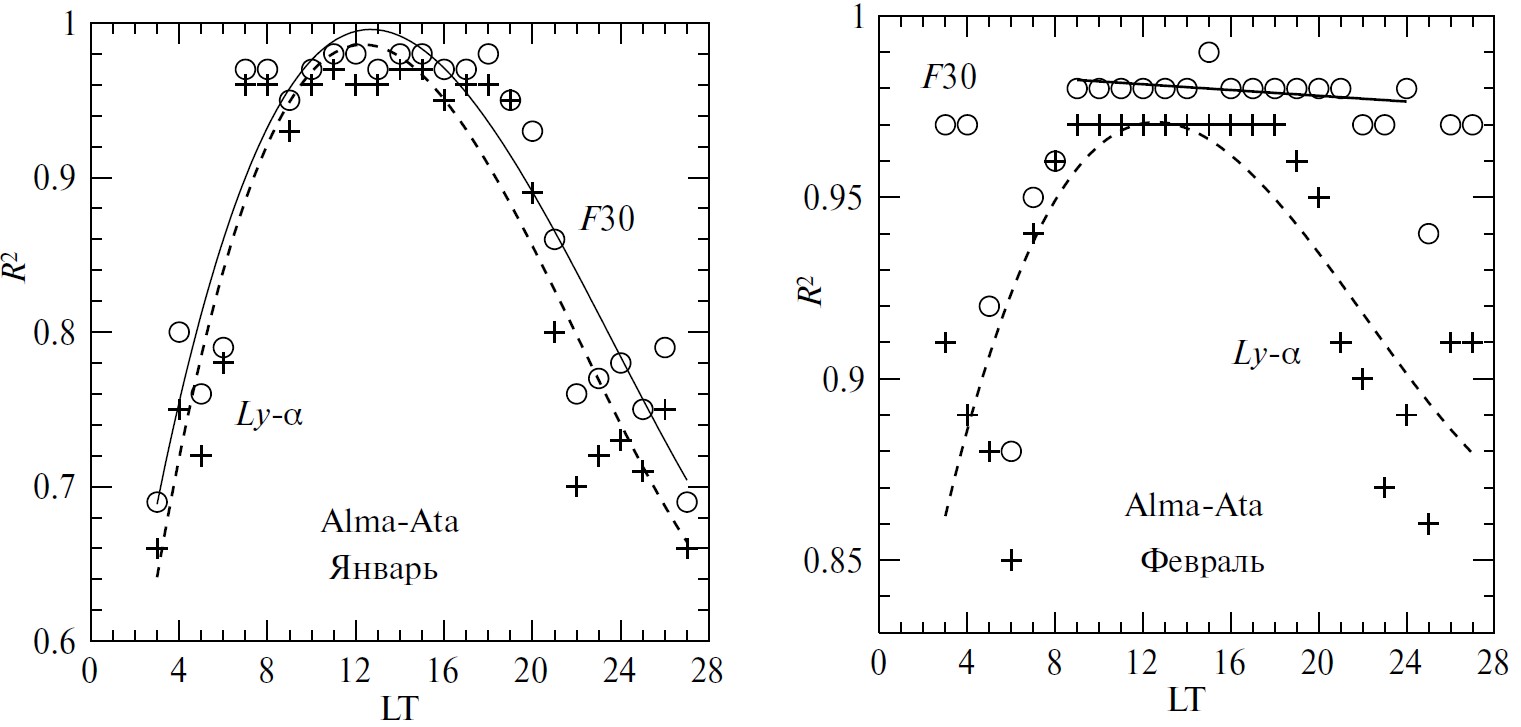Как видно из этих рисунков, для указанных двух станций также наблюдается выраженный суточный ход R2 с достаточно высокими (0.97—0.98) величинами в дневное время. Некоторое исключение представляет собой ситуация для F30 в феврале на ст. Alma-Ata — дневное плато там является особенно длинным, а падение к утренним, вечерним и ночным часам выражено хуже, чем для приведенных на том же рисунке данных по Ly-α.