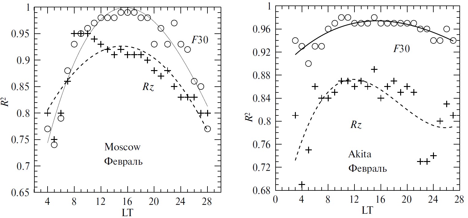 Рис. 5. Примеры суточного хода R2 для индексов Rz и F30 (ст. Moscow и Akita).