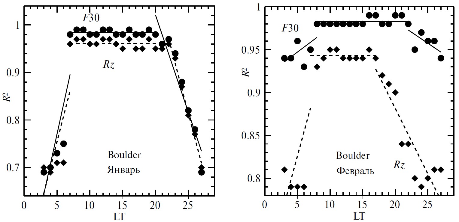 Так же, как и для Евразийских станций, для ст. Boulder наблюдается превышение величин R2 для F30 над соответствующими величинами для Rz, причем это превышение лучше выражено для февраля, чем для января.