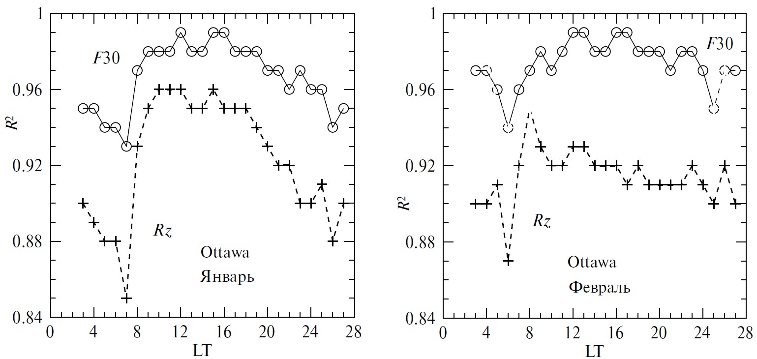 Обращает на себя внимание тот факт, что превышение величин R2 для F30 над соответствующими величинами для Rz в случае ст. Ottawa хорошо выражено как в феврале, так и в январе.