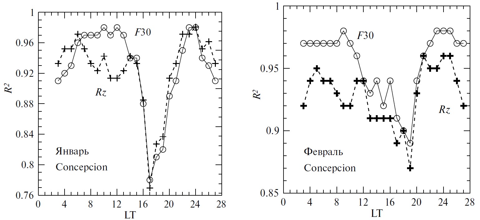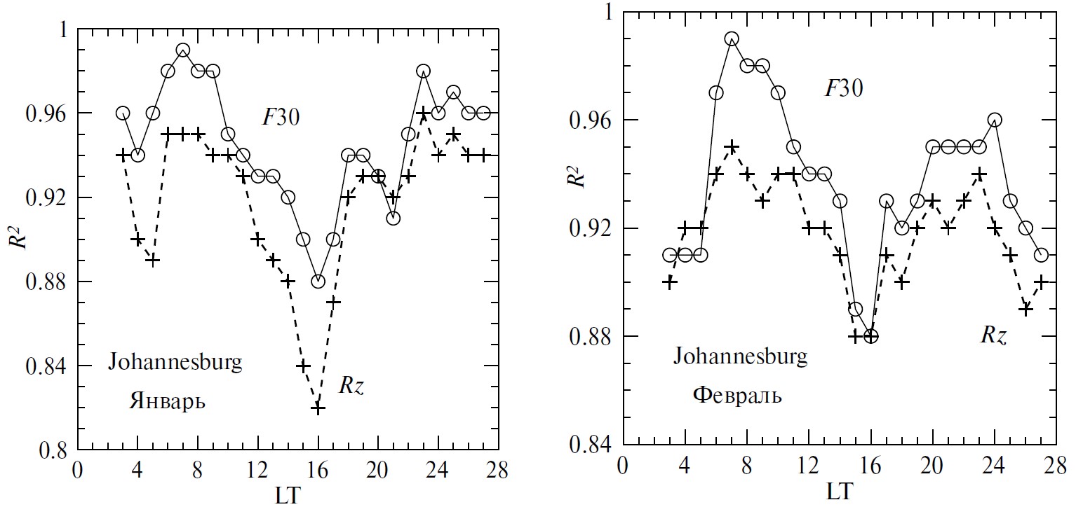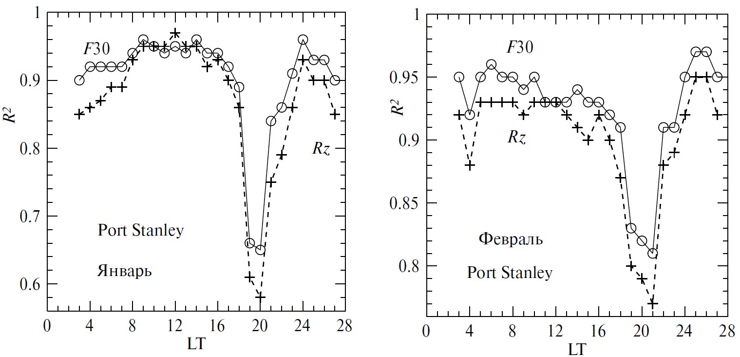Для каждого из анализируемых месяцев (январь, февраль) мы строили для каждого часа местного времени зависимость foF2 от выбранного индекса СА. Эта зависимость аппроксимировалась полиномом третьей степени. Как меру качества описания экспериментальных величин foF2 указанной аппроксимацией мы рассматривали коэффициент определенности R2 согласно F-тесту Фишера. Этот параметр легко определяется при построении соответствующего графика и является достаточно наглядным. Он прямо связан со среднеквадратической ошибкой σ описания поведения foF2 данным индексом СА в заданной ситуации (станция, месяц, момент LT).
