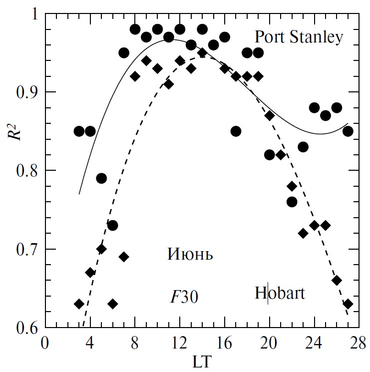 Хотя зимняя ситуация подробно рассмотрена в параграфе 2, мы для контроля рассмотрели зависимость R2 от LT на двух станциях Южного полушария в зимний месяц июнь. Результаты приведены на рис. 12.