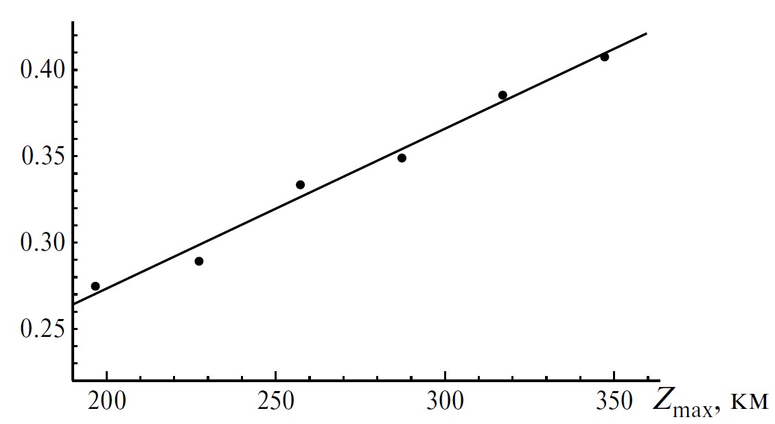 При увеличении высоты максимума слоя, напротив, наблюдается замедление сползания серпа. Так, для Zmax = 287 км имеем 14.3 км на каждые 5 км, при Zmax = 317 км (рис. 6, кривая б) — 13 км на 5 км.