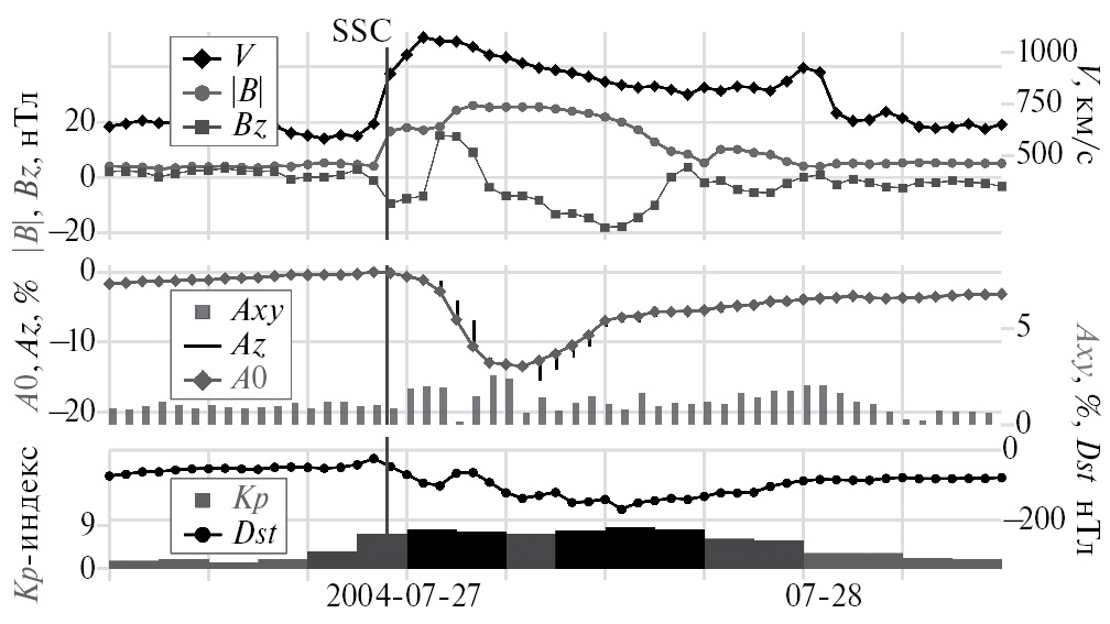 4. Рис. 3. Событие 26−28 июля 2004 г., в котором зарегистрирована очень сильная ГМБ (Крmax = 9–) и большой ФЭ (14.4%).
